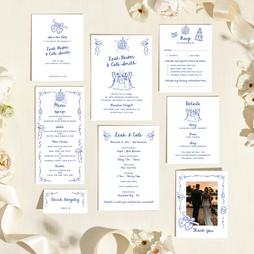 Live the suite life, AKA matching everything. Dusty blue wedding invitation suites are a great way to express your style — create your own with everything from custom save the dates and RSVP cards to menus and programs.