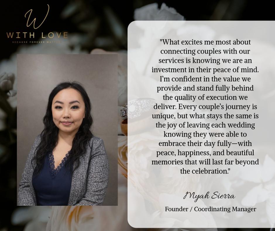 We believe every couple deserves the gift of support, which is why having a wedding coordinator by your side should be an option for all. At With Love, we’re here to honor that story by turning your wedding day into a heartfelt reflection of the two of you. With thoughtful details, seamless planning, and a touch of magic, we create an experience that feels effortless yet unforgettable. From the quiet, tender moments to the grand celebrations, our passion is making sure your day unfolds exactly as you dreamed—filled with love, joy, and memories to last a lifetime. We are a proud member of the CWP Society and Certified Wedding Associate.