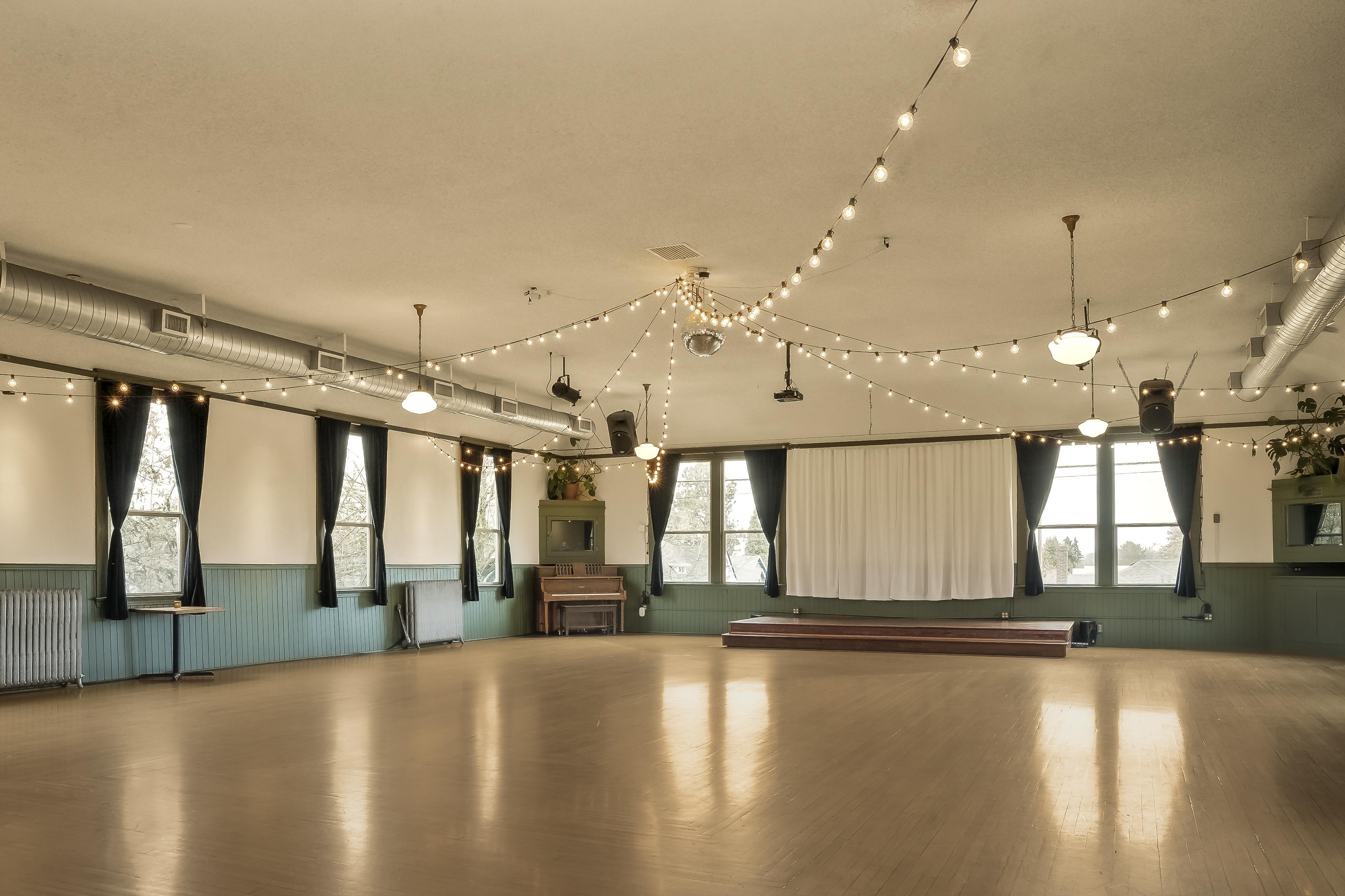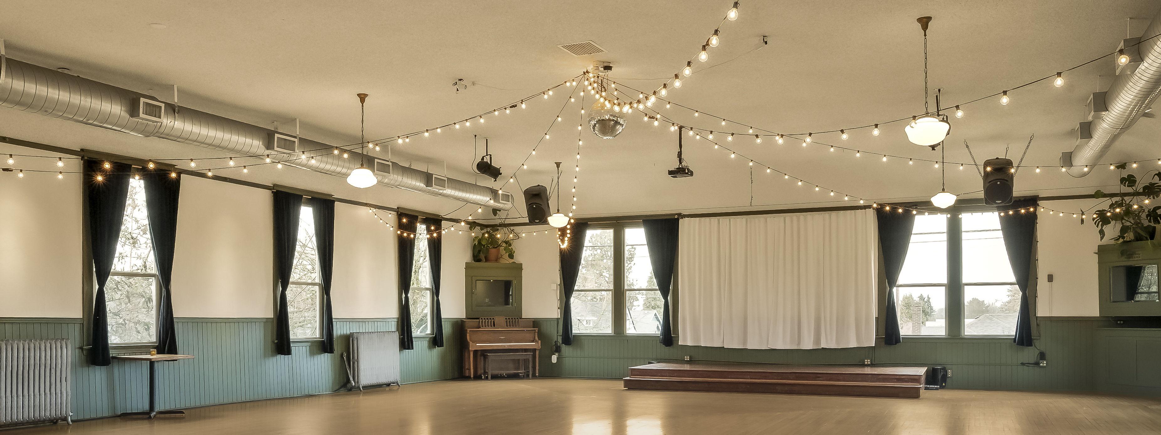 The Village Ballroom was established in 1909. If the handcrafted hardwood floors could talk, we would fill a library with stories from the gatherings and celebrations that have been shared within. The enchanting ballroom sits on the second story of the turn-of the-century building, and many of its historic features remain today, such as ornate radiators and milk glass light fixtures. Adjacent to the ballroom is a comfortable sitting lounge, as well as a bar/beverage service room. Every rental package includes use of our our tables and chairs, as well as our in-house sound system. With a 250-standing capacity and 130-sitting capacity, it can accommodate both intimate and large gatherings. The Village Ballroom welcomes all expressions of love and celebration, and will treat every client with respect and professionalism, offering clear communication and transparent policies from the initial inquiry process through event execution.