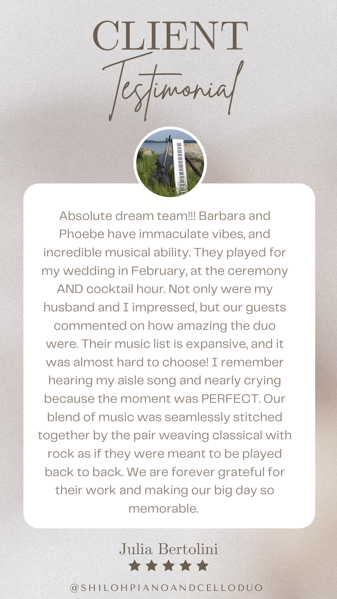 Shiloh made our day even more special. The sound of the cello and piano together was wonderful, and perfectly matched the mood. Of course, they were very professional, timely and easy to communicate with. Thank you!