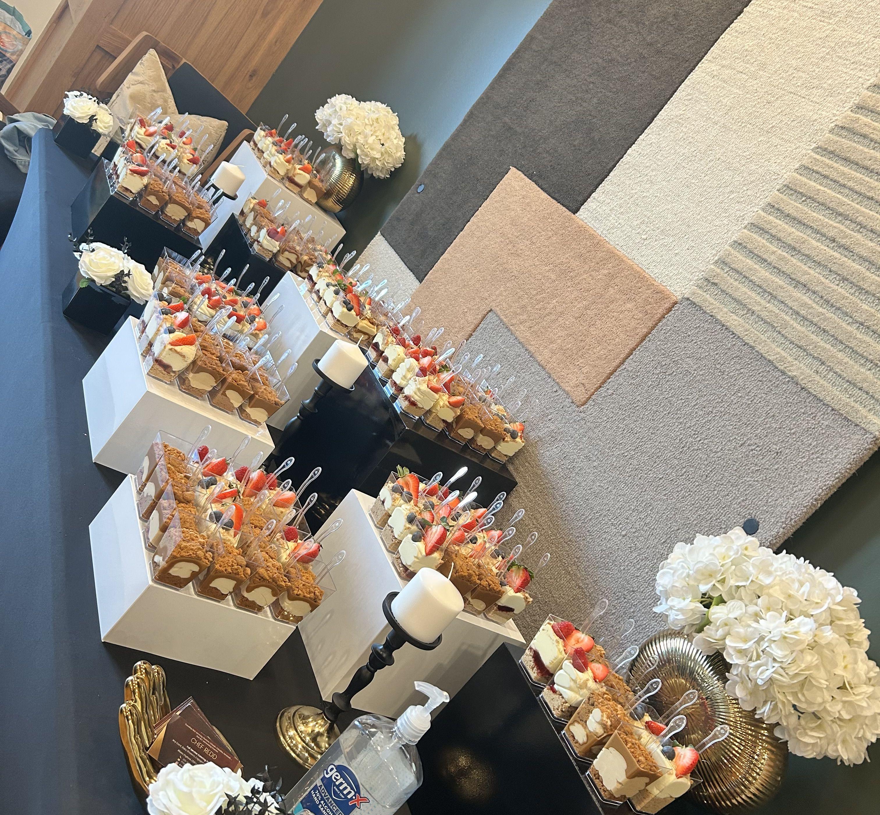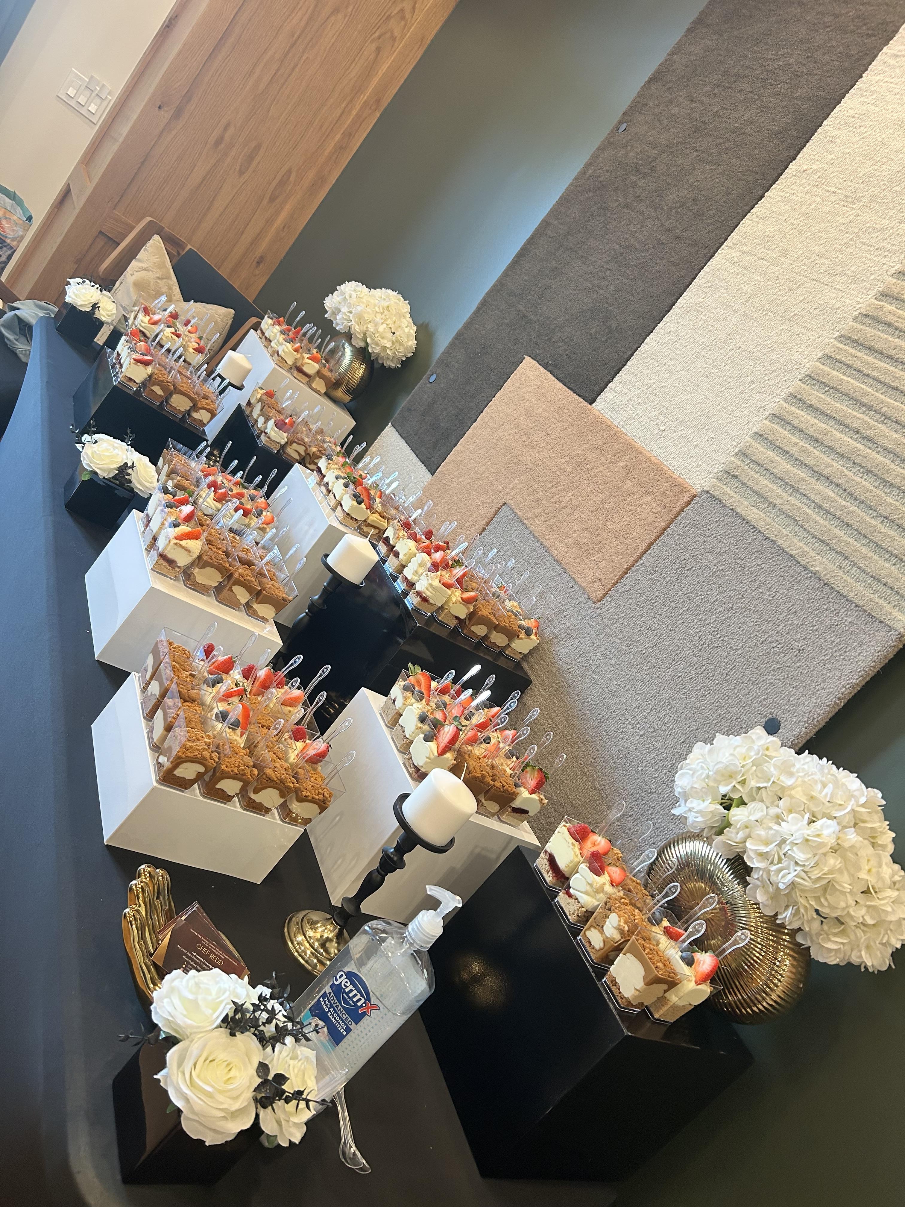 We have various packages for clients budgets starting at $23.99-64.99 per plate. We offer Buffet style setups, Full service with staff, Plated Meal experiences, Butler passed Appetizers, and so much more.
