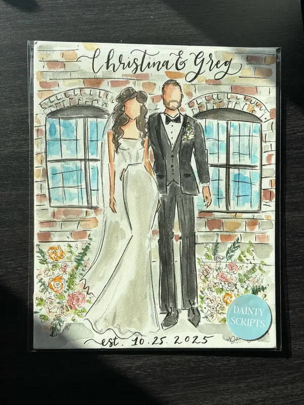 The Dainty Scripts team paints live guest portraits on-site during your event. Starting during cocktail hour, the team blends seamlessly into the celebration—offering guests an experience that's both interactive and heartwarming. Each custom illustration is painted with care, giving your guests a lasting reminder of your special day. A perfect twist on event favors and added entertainment your guests will love. Service includes a 8x10 illustration of the wedding couple and 5x7 illustrations of your guests. We also offer custom signage upon request!