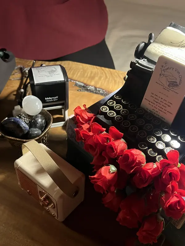 Poetry Von Chelle is an intuitive on-the-spot typewriter poet, a unique art form that blends the timeless craft of poetry writing with the spontaneity of a live performance. With the star of the show, a vintage typewriter, Von Chelle takes literary snapshots of heartfelt human connection and crafts it into words of wisdom and wonder. Each poem is a reflection of the moment, turning brief interactions into heartwarming and memorable verse. The tactile experience of hearing the typewriter keys strike the paper adds an element of nostalgia and authenticity, making each poem an immersive and intimate experience for all.