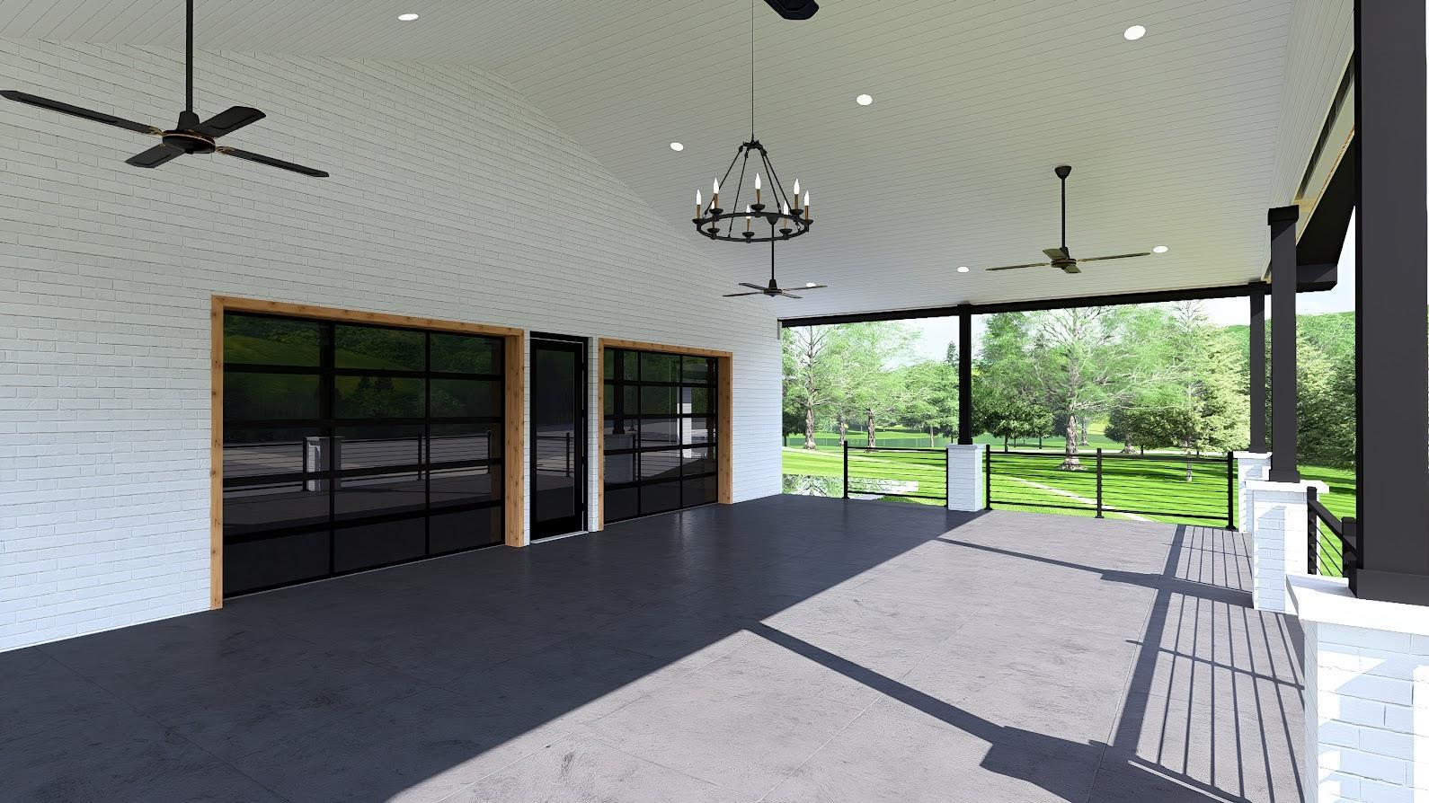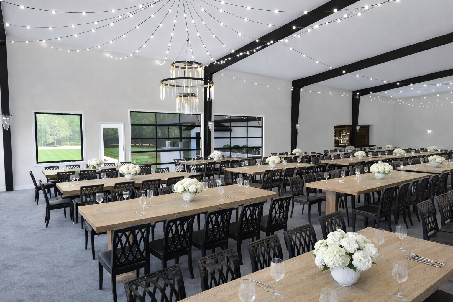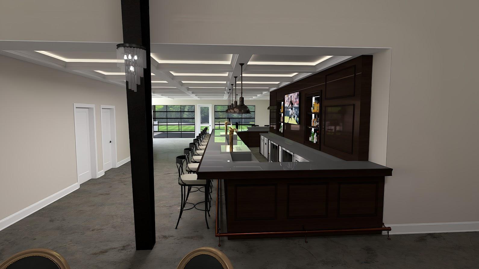 Windows overlooking the acreage, garage doors opening to the social patio, farmhouse tables, access to two expansive bars.