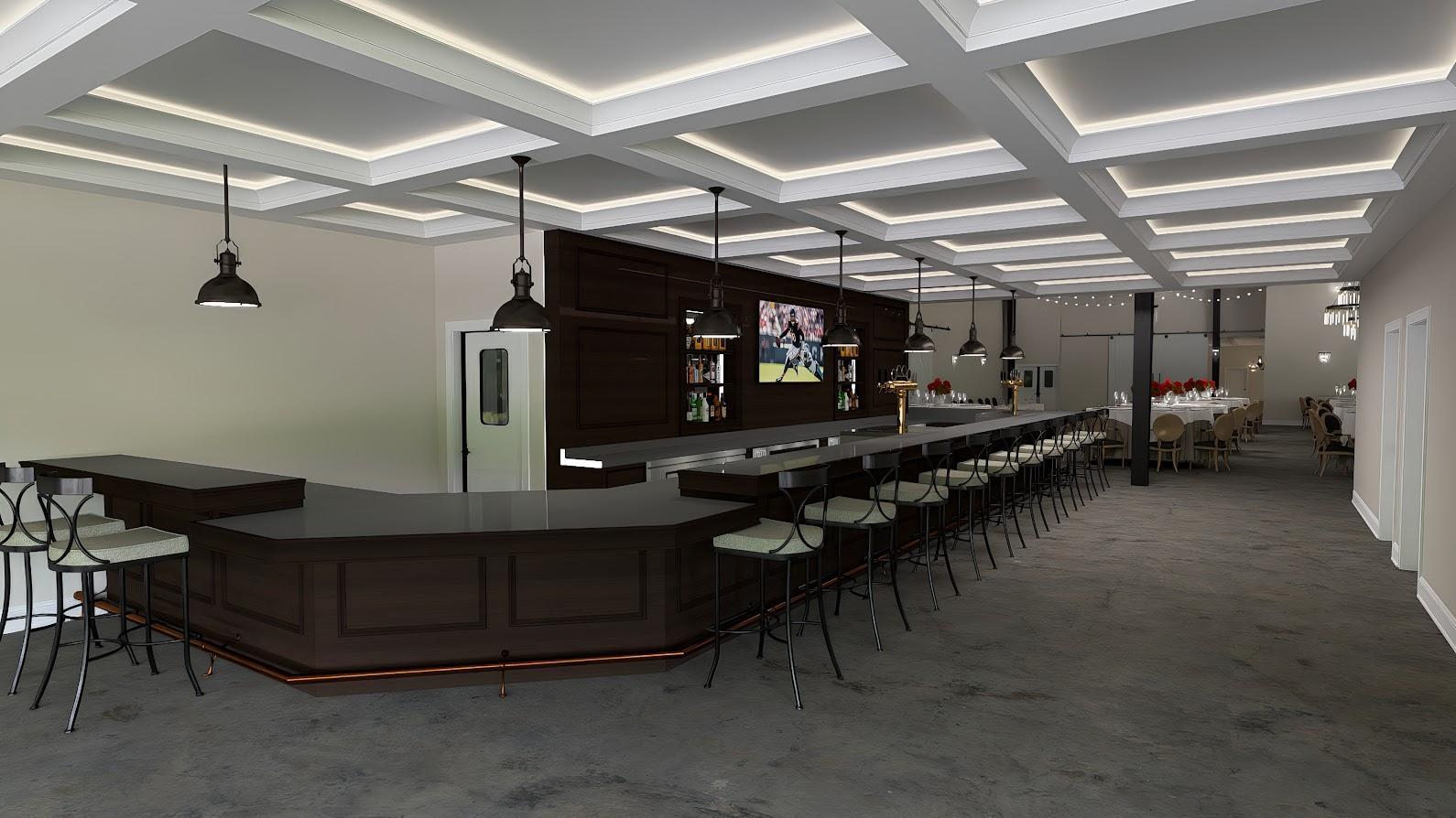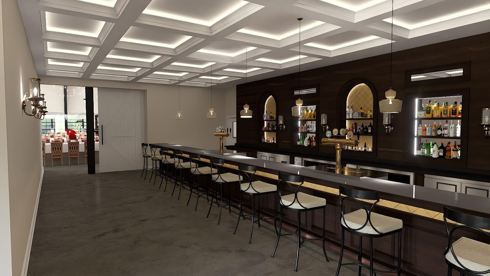 This space offers its own entrance, 40 Ft. Barrel Bar, Built-in TV, polished concrete floors and more.