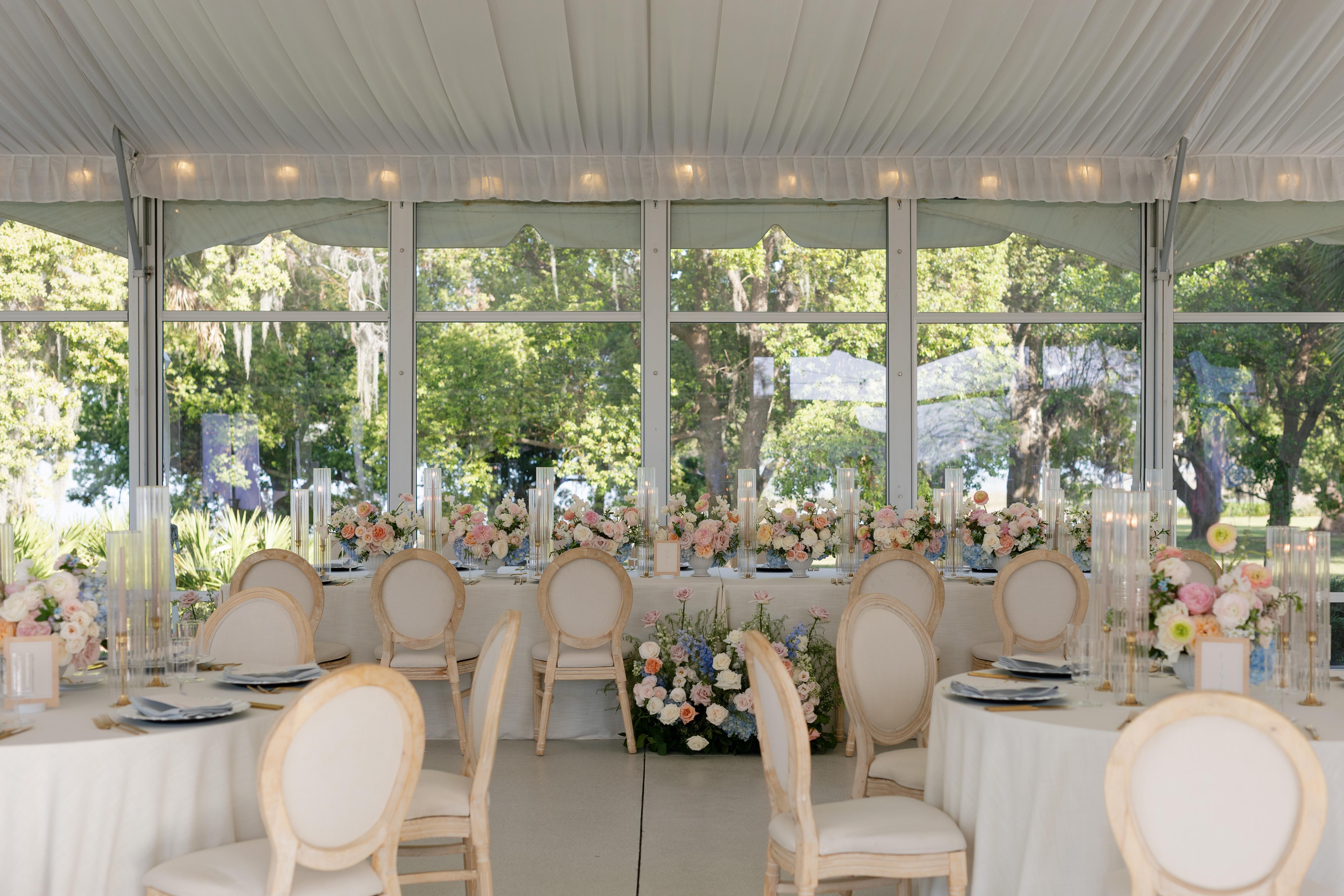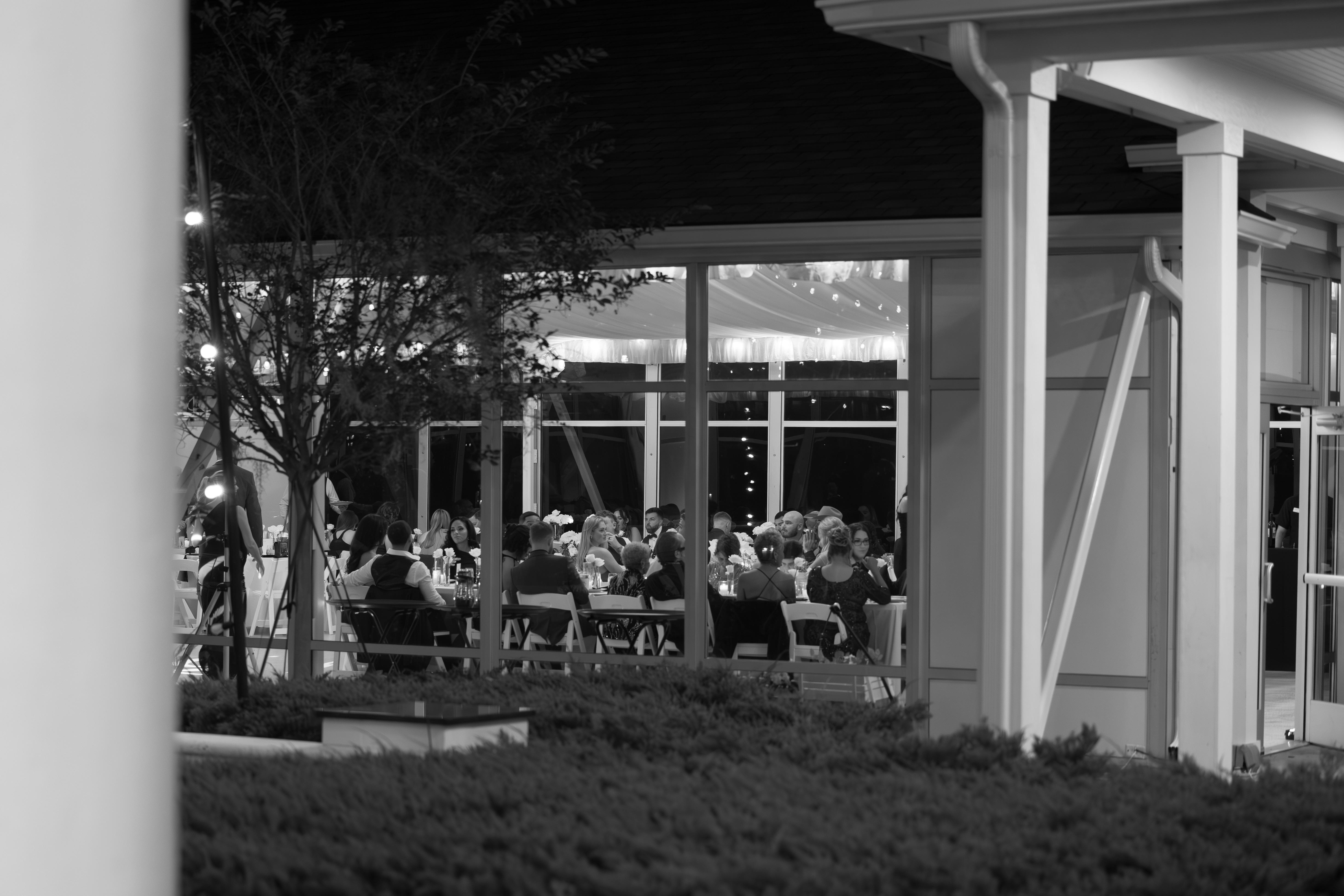 The Celebration Space Just steps from the Estate House, the glass-enclosed Pavilion offers breathtaking lake views and elegant, climate-controlled comfort. Features: • Seats up to 200 guests comfortably • Vaulted ceilings with modern chandeliers and soft draping included • Expansive glass walls overlooking Lake Alfred • Access to the adjoining open-air Terrace and lakeside lawn • Fully integrated power, lighting, and climate systems for effortless planning