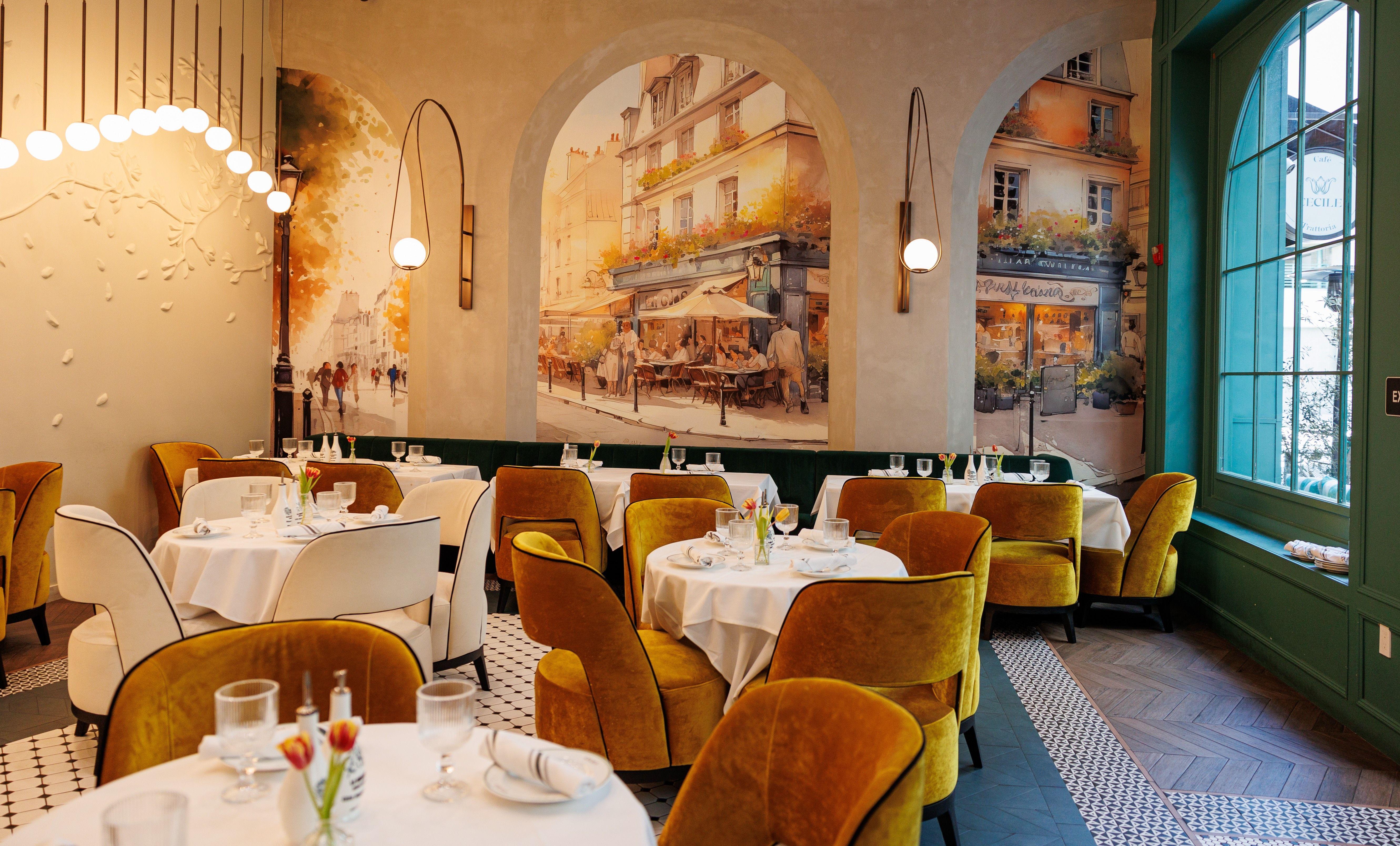 The main dining room at Cécile Trattoria is a warm, European-inspired space defined by soft lighting, elegant architectural details and a refined yet inviting atmosphere. High ceilings and sculptural lighting create a sense of openness. Plush velvet seating in rich tones is paired with white table settings providing comfort and sophistication. The layout is thoughtfully designed to feel intimate without being crowded, making it ideal for both private celebrations and larger gatherings.