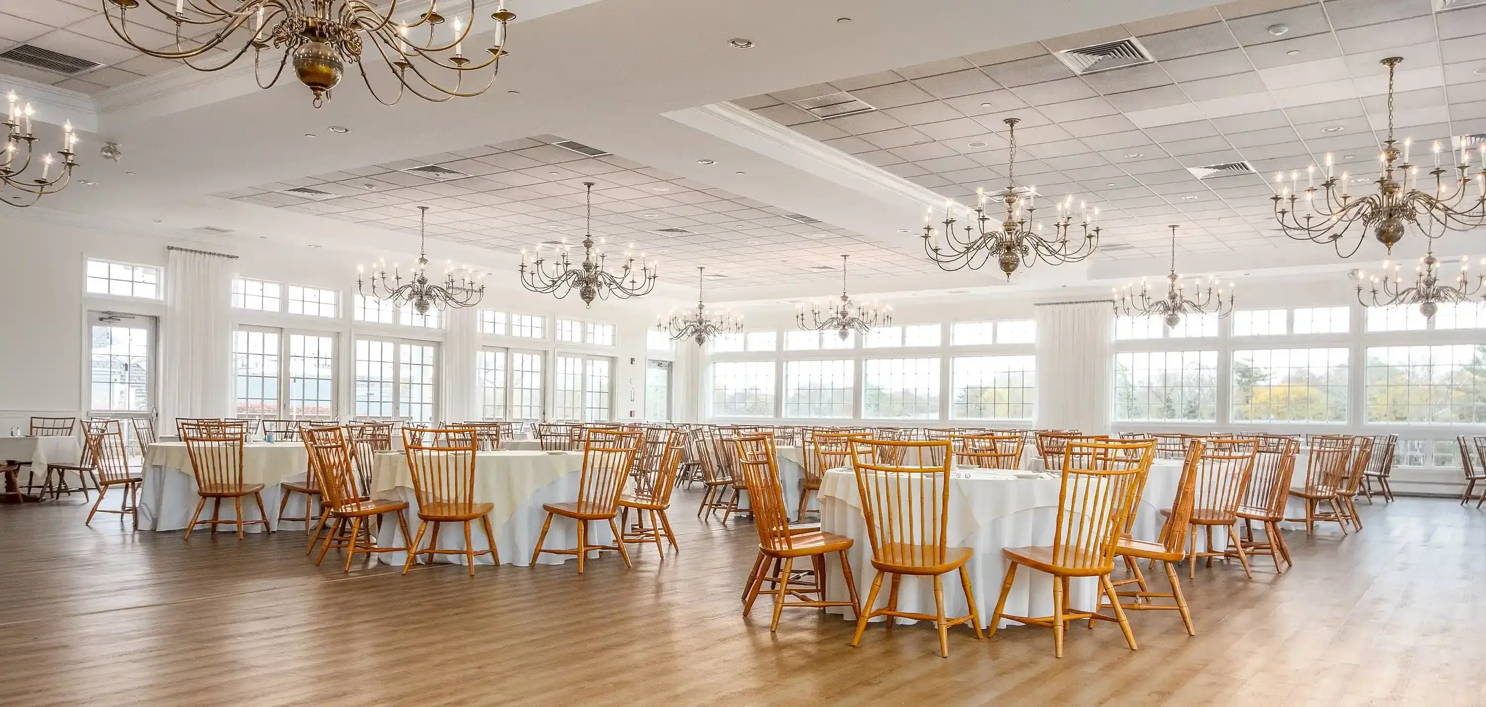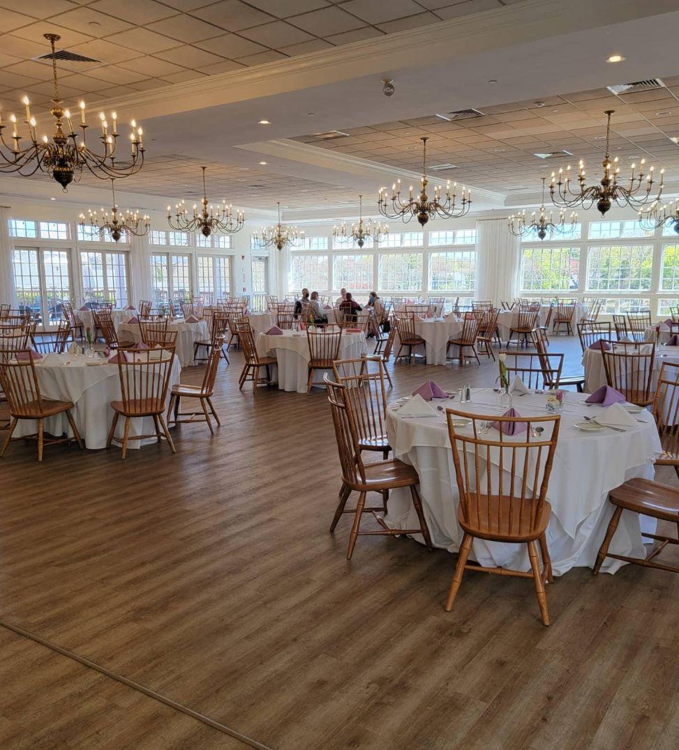 This premier ballroom is the epitome of coastal sophistication. It features polished wooden floors, classic brass chandeliers, and large windows that bathe the space in natural light while offering views of the grounds. With its neutral palette and airy feel, it serves as a stunning blank canvas for any wedding aesthetic, from classic nautical to modern chic.