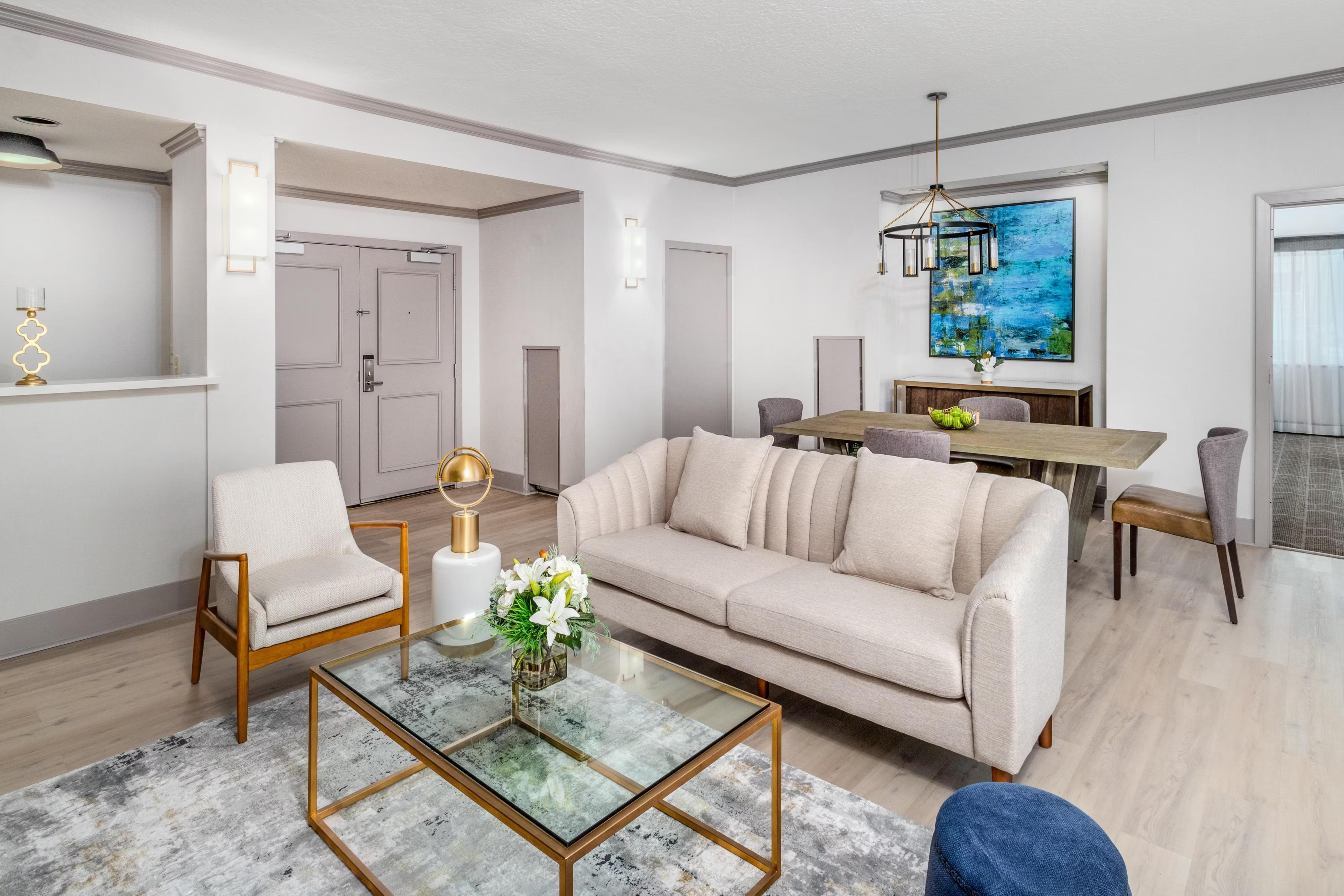 The exceptionally curated suites offer a residential feel with all the luxuries of a high-end hotel, making it a standout choice for your wedding weekend. The space features a chic, mid-century modern aesthetic with a plush neutral sofa, gold-accented glass coffee tables, and a dedicated dining area perfect for pre-wedding toasts. With its separate living area, warm wood-slat accent walls, and expansive windows.