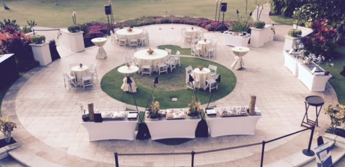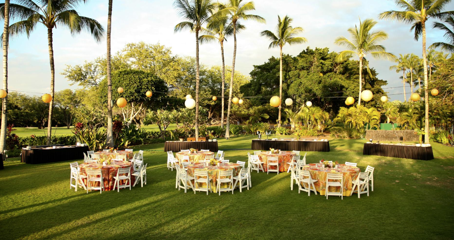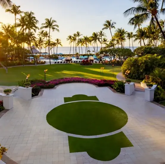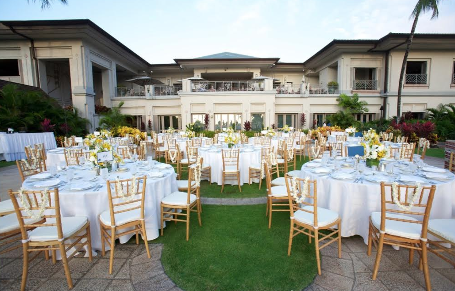 Framed by stately palms, this manicured lawn offers a sophisticated sense of privacy and "old Hawaii" charm. The estate provides a stunning dual perspective, overlooking the lush greens of the championship golf course with the sparkling Pacific Ocean just beyond the horizon. Featuring a unique, raised natural stage—perfect for a romantic head table or live entertainment—this venue combines the intimacy of a secluded estate with the convenience of being just a short stroll from the resort lobby.