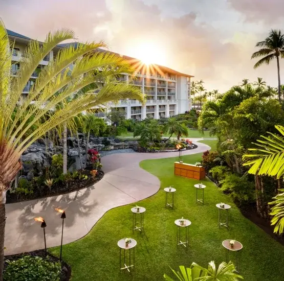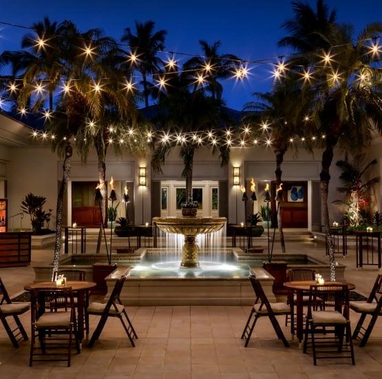Situated on the lobby level, this venue seamlessly transitions from a sophisticated pre-function foyer to a vibrant, open-air courtyard. The space features stylish modern seating, charming café lighting strung between stately palms, and the warm glow of traditional tiki torches surrounding a beautiful central fountain. It is a captivating setting for a memorable cocktail reception or an intimate dinner under the stars, offering an effortless blend of contemporary comfort and authentic island ambiance.