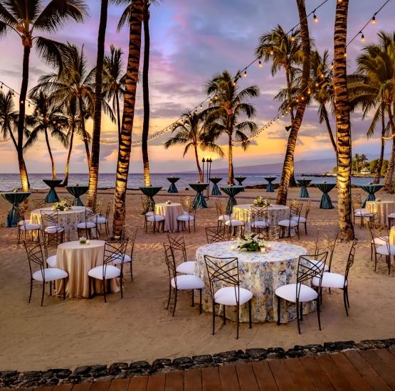 Host your event in a sandy coconut grove with towering palms overhead. Adjacent to the ancient Keanapou fish pond, this site also features swaying palms and glowing tiki torches. For those dreaming of a tropical woodland vibe, this venue features a lush grove of towering coconut palms swaying in the sea breeze. The sandy floor and dappled sunlight create a relaxed yet elegant atmosphere for a ceremony or a barefoot-luxury reception. At night, the grove transforms into a magical space with the potential for twinkling lights and torches, offering an immersive island experience tucked away in a private, shaded sanctuary.