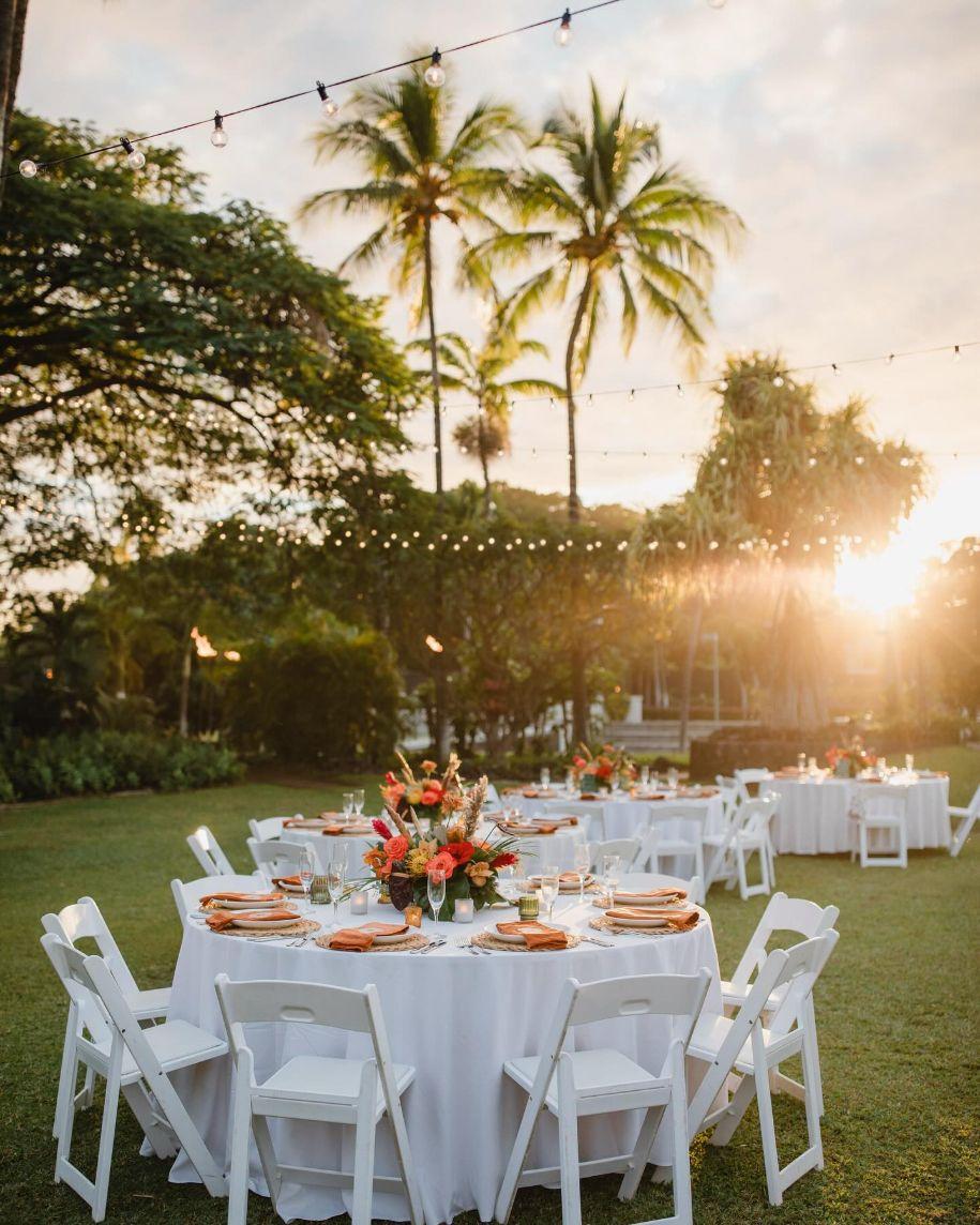 This stunning outdoor venue is perched on the water's edge, offering a panoramic backdrop of the Pacific Ocean and the majestic Kohala Mountains. Couples can exchange vows on a manicured lawn framed by natural dark lava rocks and the rhythmic sound of crashing waves. It is a quintessential Hawaiian setting that captures the raw beauty of the coastline, making it a premier choice for sunset ceremonies and elevated island receptions.