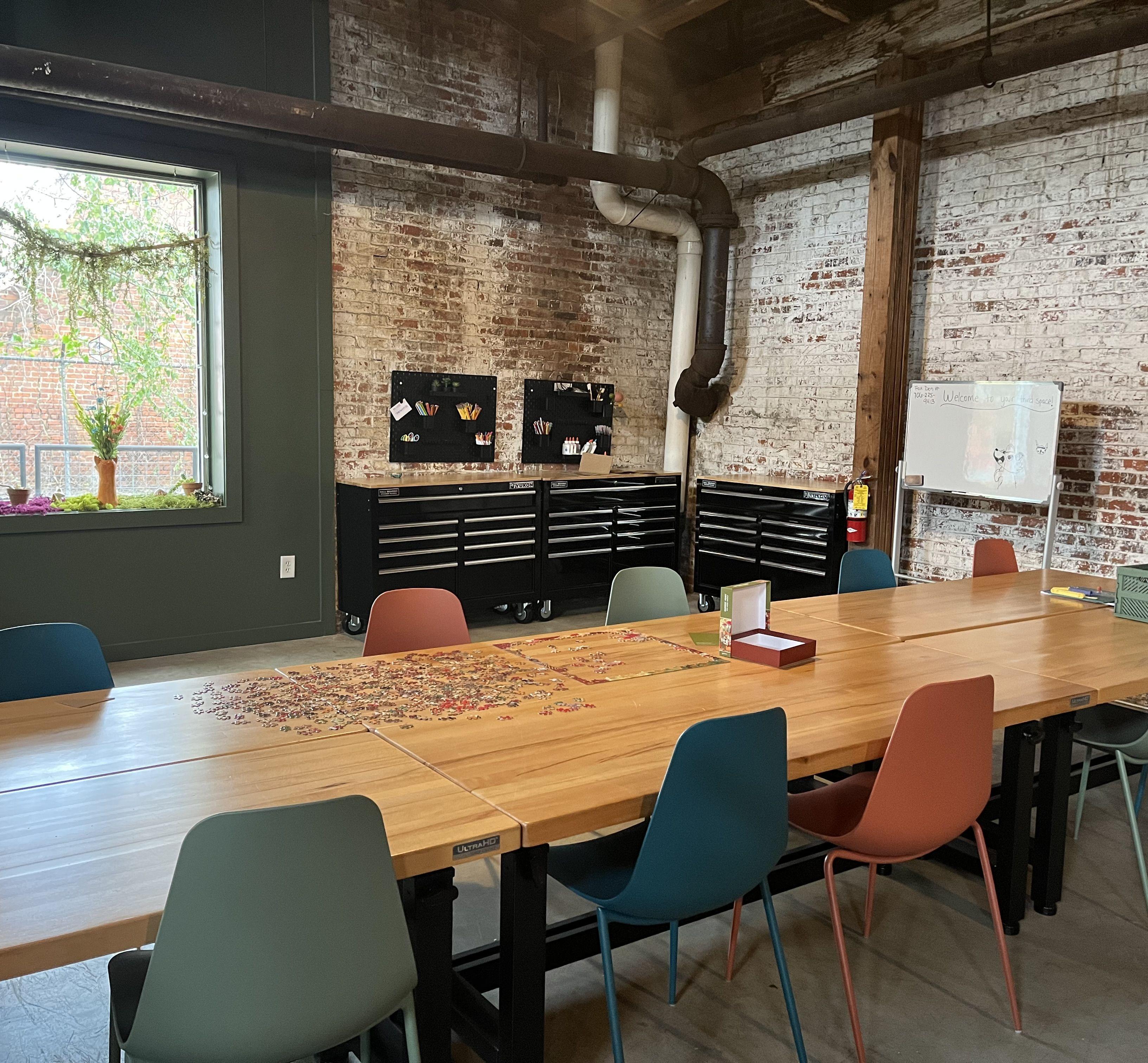 Fox Den Third Space is a cozy, creative venue inside the historic Chase Street Warehouses in Athens, Georgia. Originally built in the early 1900s for cotton storage and rail use, the warehouses were later restored into a vibrant arts district, giving the space real character and history. The Den blends that industrial past with a warm, inviting feel. You’ll find a large table for up to 20, an oversized sofa lounge, a stage for toasts or music, and flexible areas to gather and celebrate. It’s ideal for showers and small celebrations where you want a relaxed, intimate vibe that still feels special.