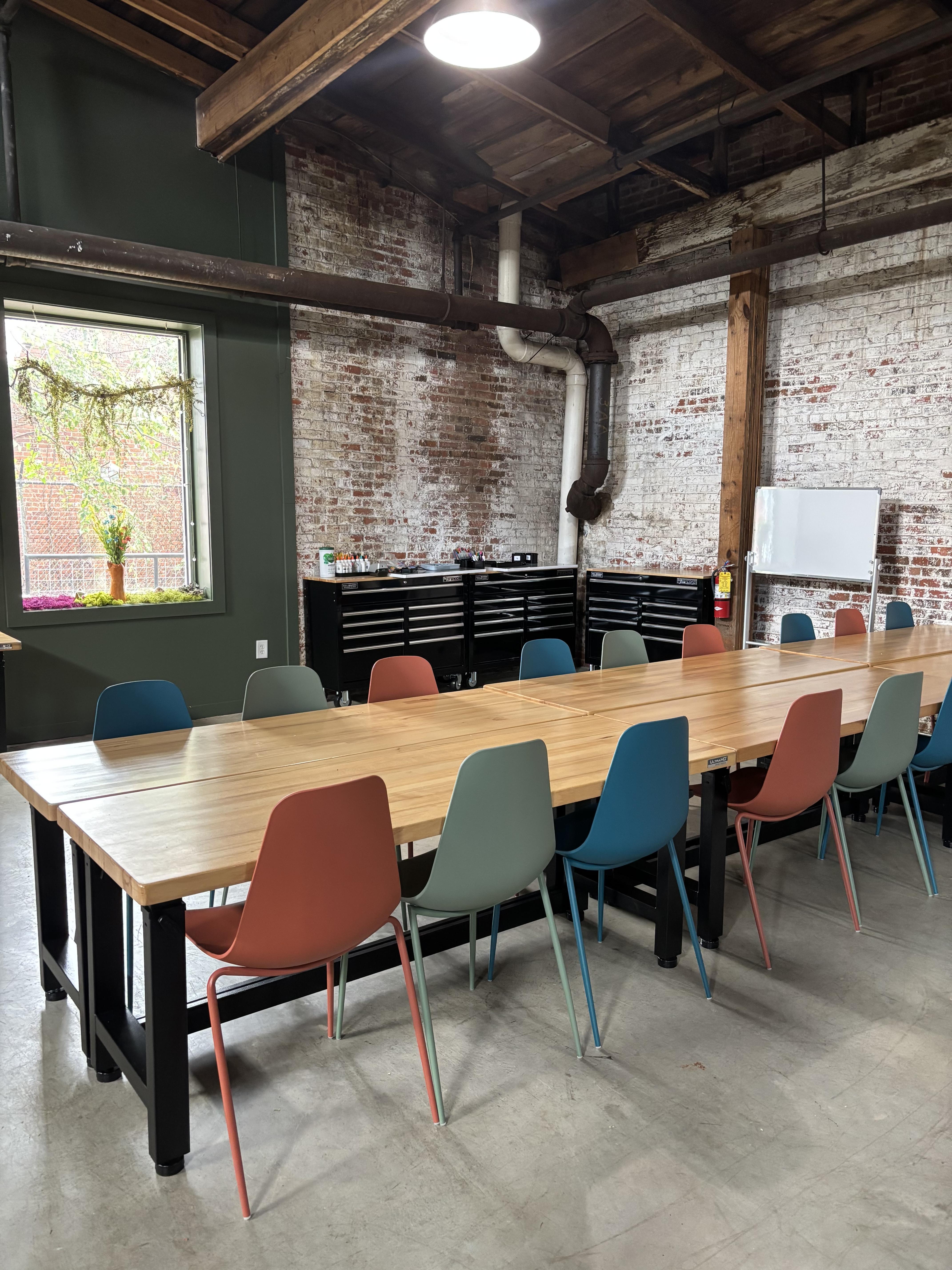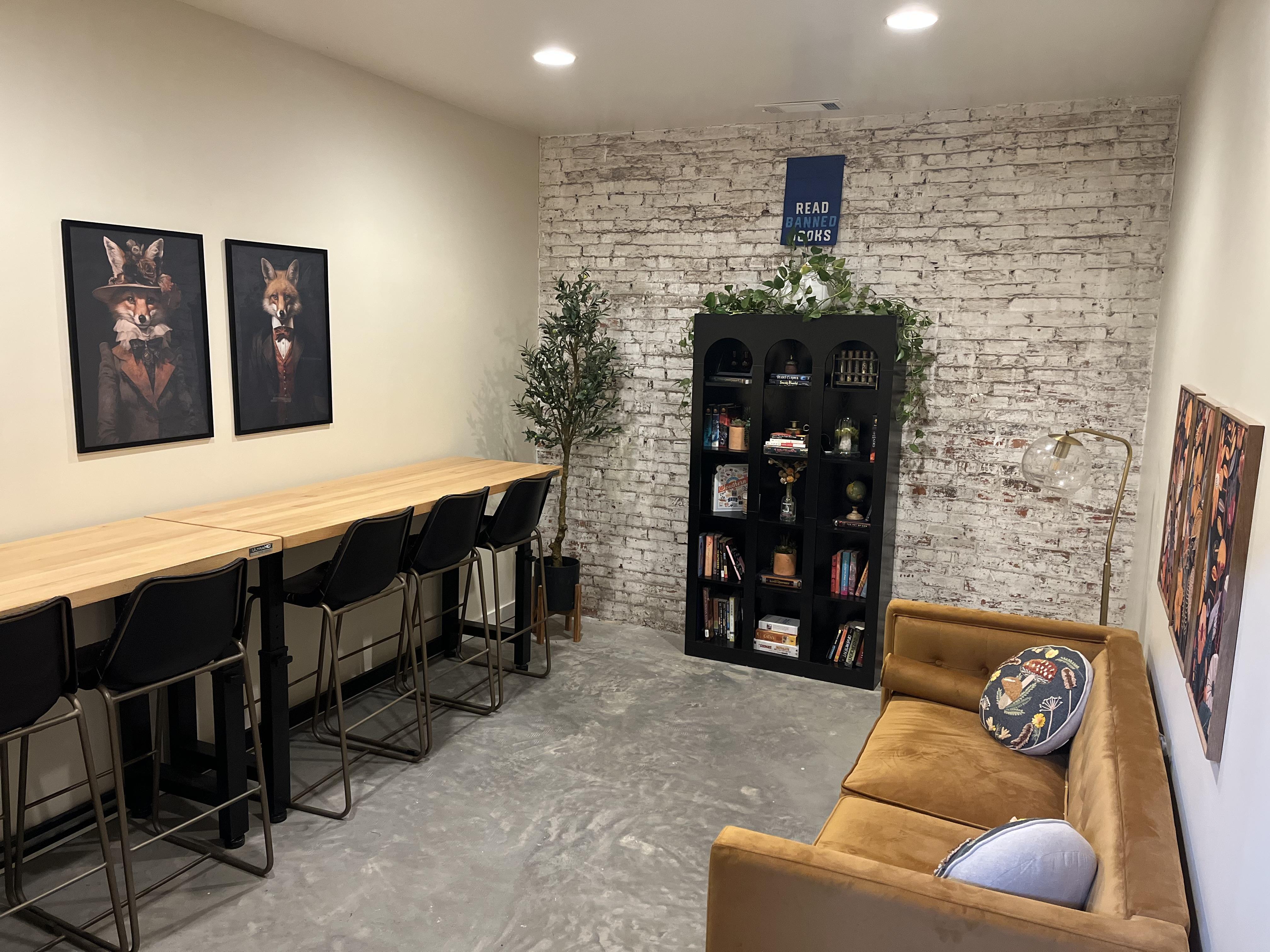A large, cozy space designed for gathering and connection. Features include a table that seats up to 20, an oversized sofa, a stage area, a lounge, a dedicated Dungeons and Dragons room, and a bouldering wall. The layout is flexible, making it easy to host baby showers, parties, and relaxed group events in a space that feels both playful and comfortable.