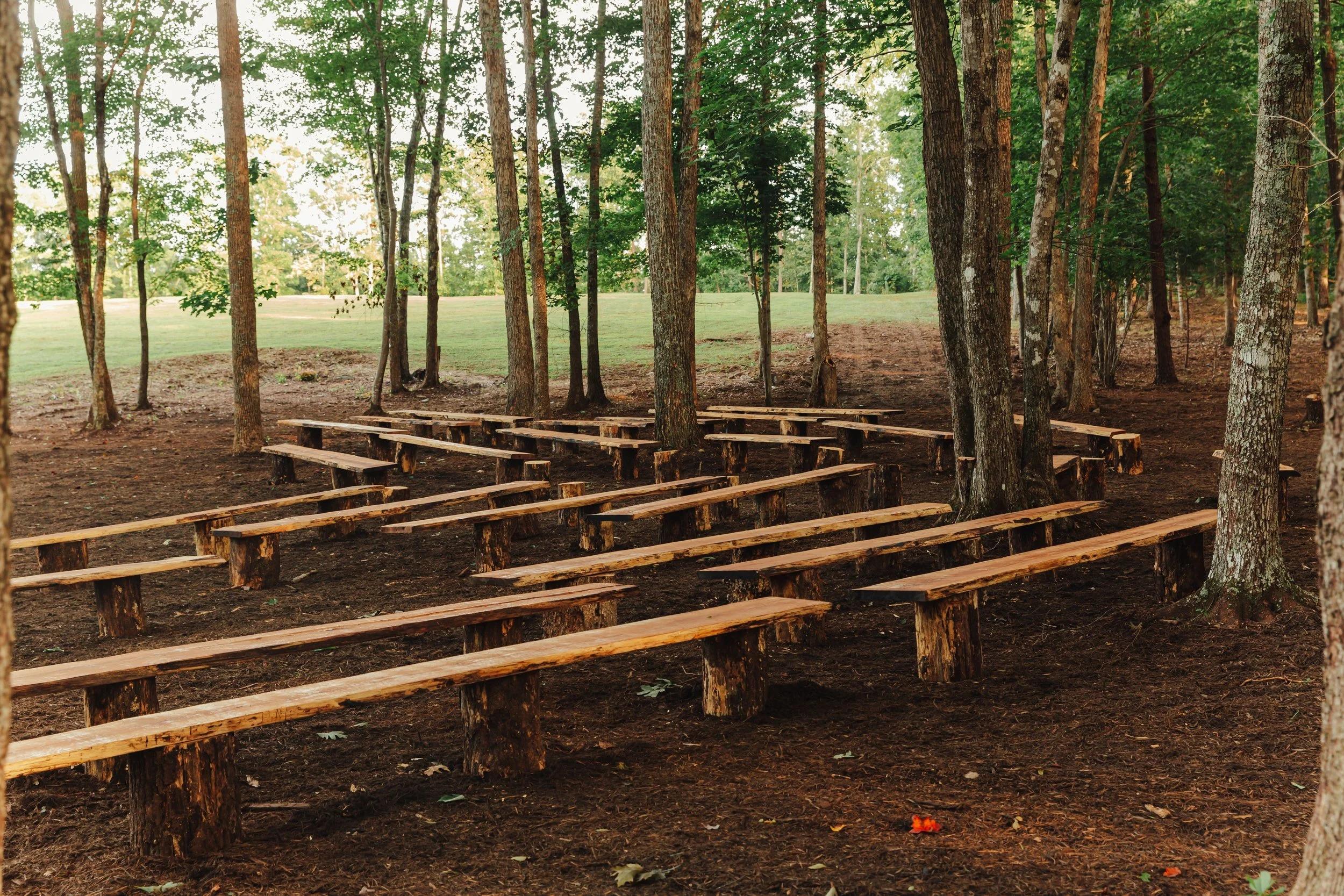 Exchange your vows in a serene woodland sanctuary where nature provides the ultimate altar. This enchanting ceremony site features a canopy of towering oak trees that filter dappled sunlight onto your celebration, creating a magical, "enchanted grove" atmosphere. Guests can witness your union from rustic, raw-edge wooden benches that blend seamlessly into the forest floor. With the gentle sounds of the breeze and HeartRock’s signature heart-shaped stones scattered throughout, this shaded retreat offers an intimate and grounded start to your forever in the heart of the Virginia countryside.
