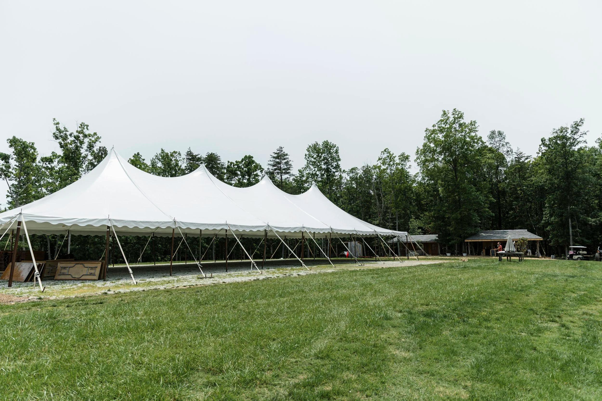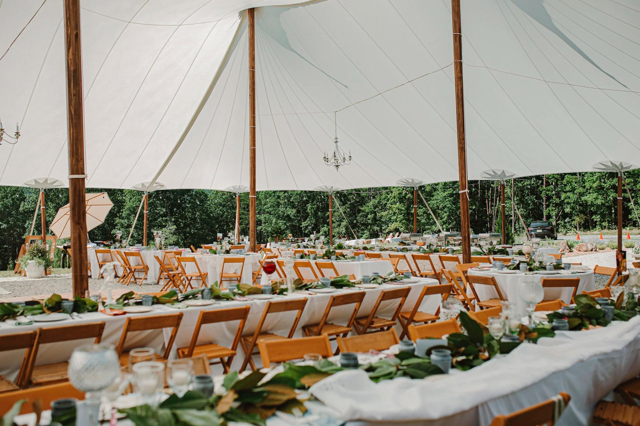 Celebrate your reception under a beautiful white tent pitched at the peak of a spacious, rolling field. This versatile outdoor space offers breathtaking views of the surrounding woods and a nearby tranquil pond, providing a true sense of "the lay of the land." The open-air setting allows you to design a custom celebration that captures the spirit of a modern homestead wedding. As the sun sets over the fifteen-acre property, the lawn transforms into a joy-filled soiree space perfect for dining, dancing, and stargazing with your closest friends and family in a relaxed, farmhouse atmosphere.