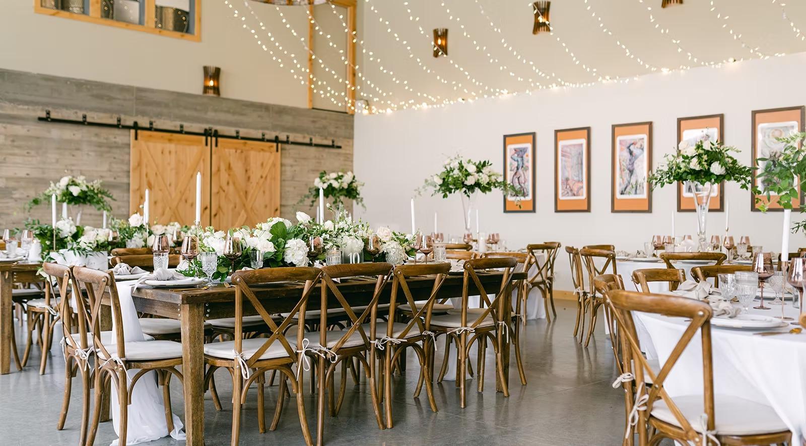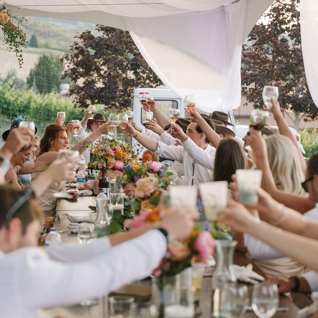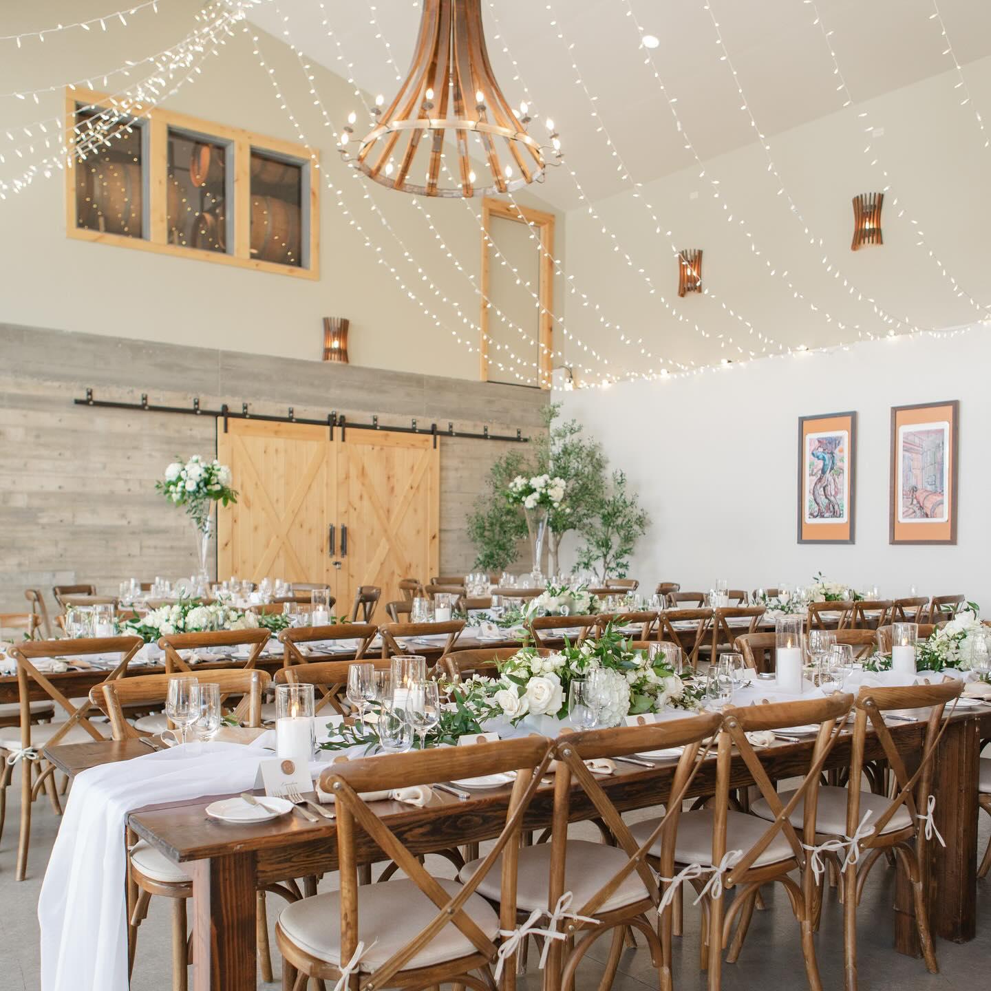 LARC Hill Vineyard Ranch offers versatile spaces that transition seamlessly from ceremony to celebration. The Courtyard serves as the property’s crown jewel, featuring an open-air setting with sweeping views of the Lake Chelan basin—perfect for sunset vows or starlit dining. For an indoor-outdoor experience, the Barn provides a sophisticated, climate-controlled environment characterized by warm wood tones and festive string lighting. The property also includes a dedicated catering kitchen and a stylish open bar area, ensuring a professional flow for your culinary service. Surrounded by rolling rows of vines, the ranch offers endless photo opportunities and a true estate feel.