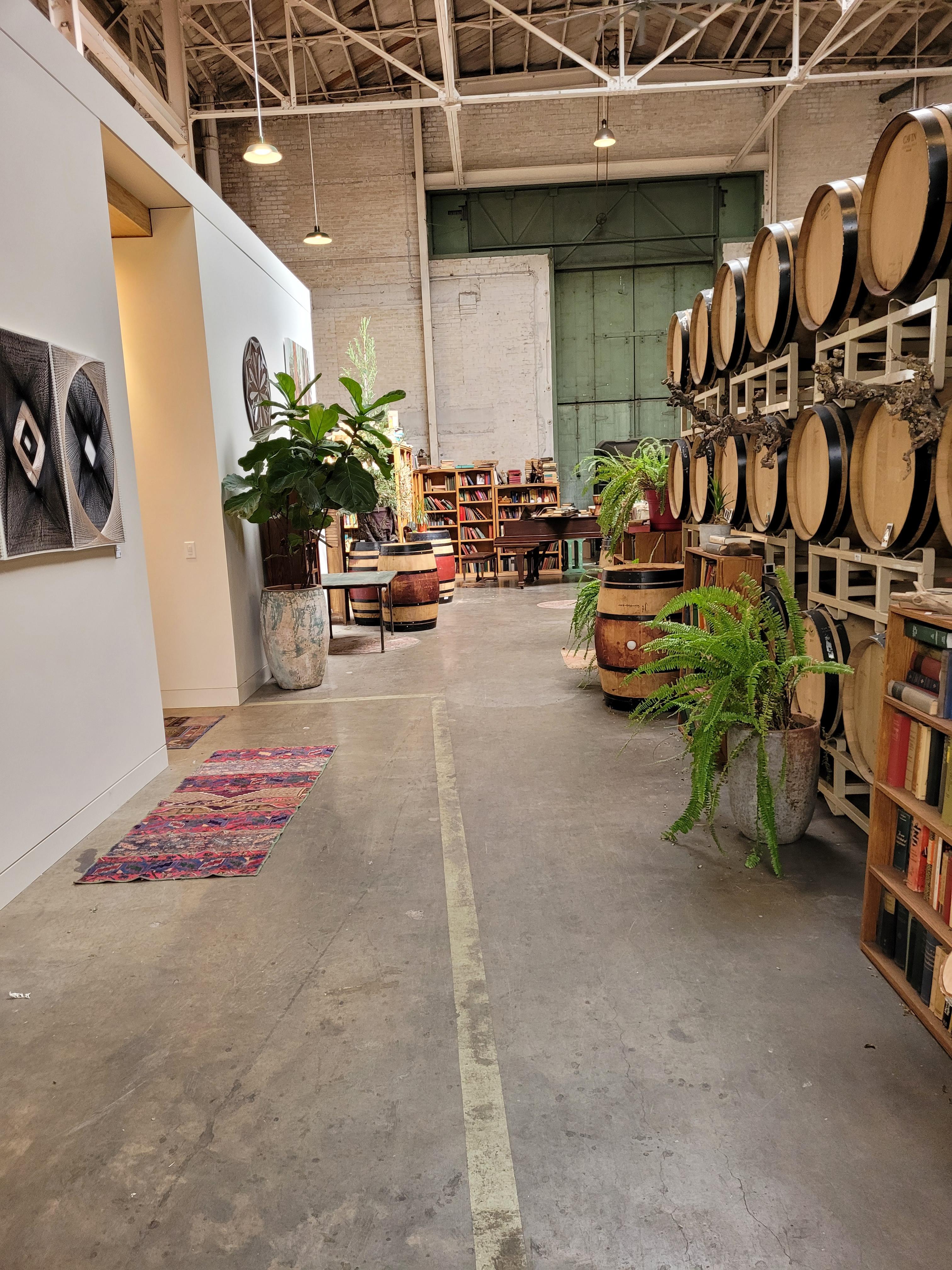 This space features a large vintage table & an eclectic mix of chairs, surrounded by barrels & styled with a few unique touches.