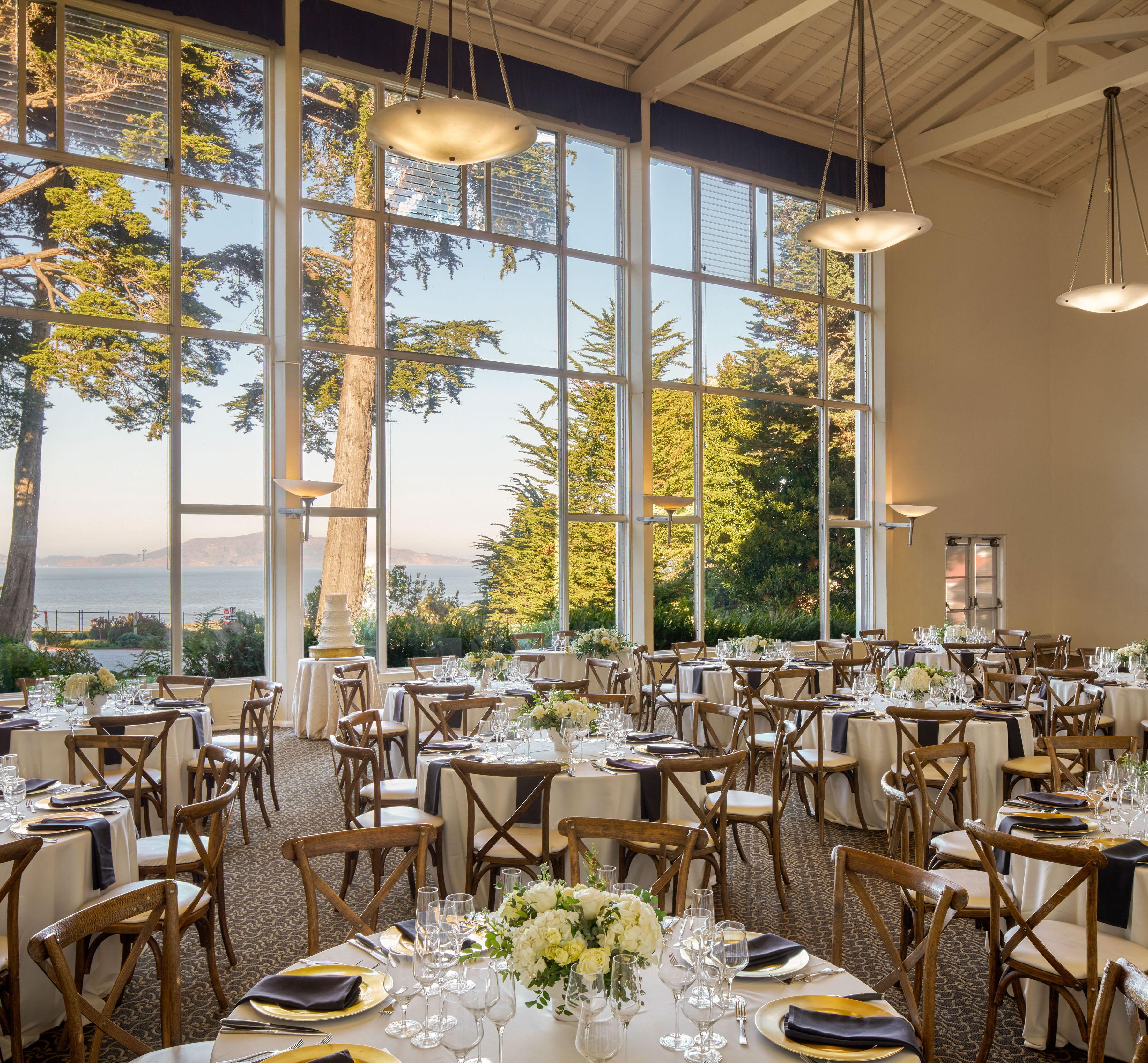 Gorgeous wedding venue with floor to ceiling windows overlooking the Golden Gate Bridge, Historic Presidio location with cathedral ceilings and choice of glorious reception spaces