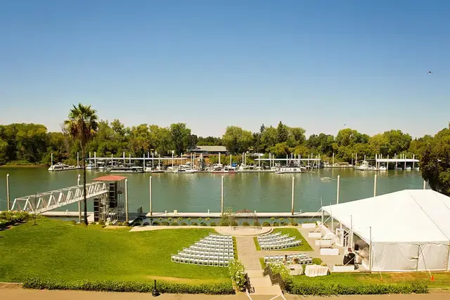 The River’s Edge (often referred to interchangeably with the Portofino area) is the signature outdoor ceremony site at the venue. It is widely considered one of the best riverfront spots in Sacramento because it sits directly on the bank without the obstruction of a high levee wall. Your vows are framed by a large, classic wrought-iron arch with a panoramic, "edge-to-edge" view of the Sacramento River.