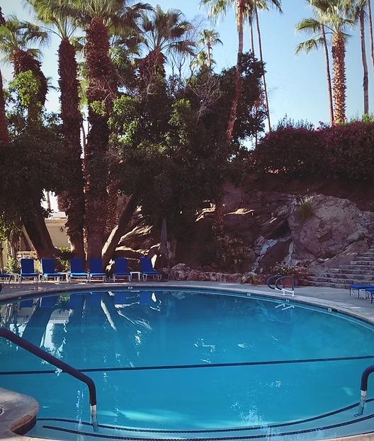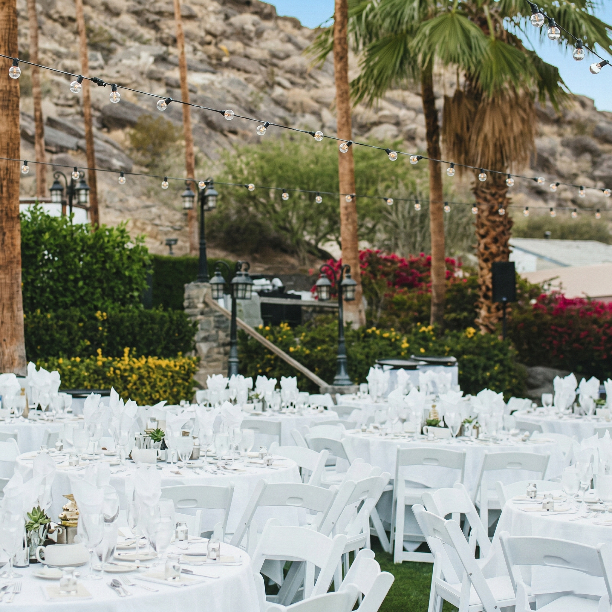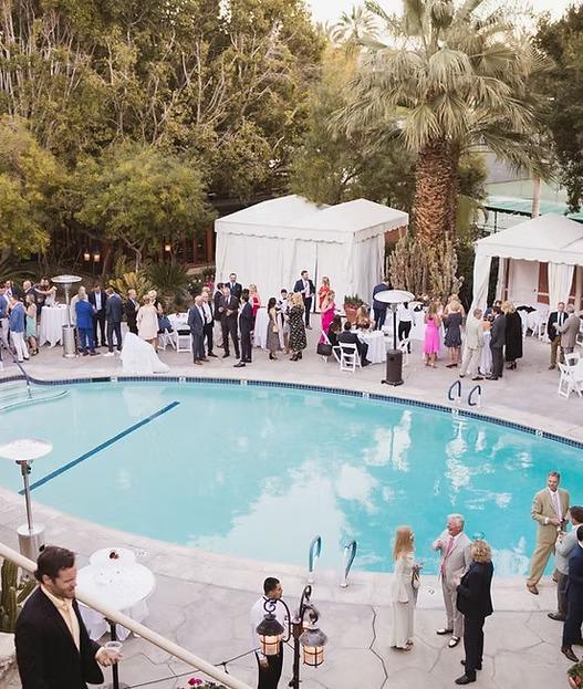 This iconic pool area, under the Bougainvillea Room and Upper Lawns is a great location for cocktail hour up to 200 guests. This area boasts beautiful desert landscape and a rock waterfall, with a chic Palm Springs feel.