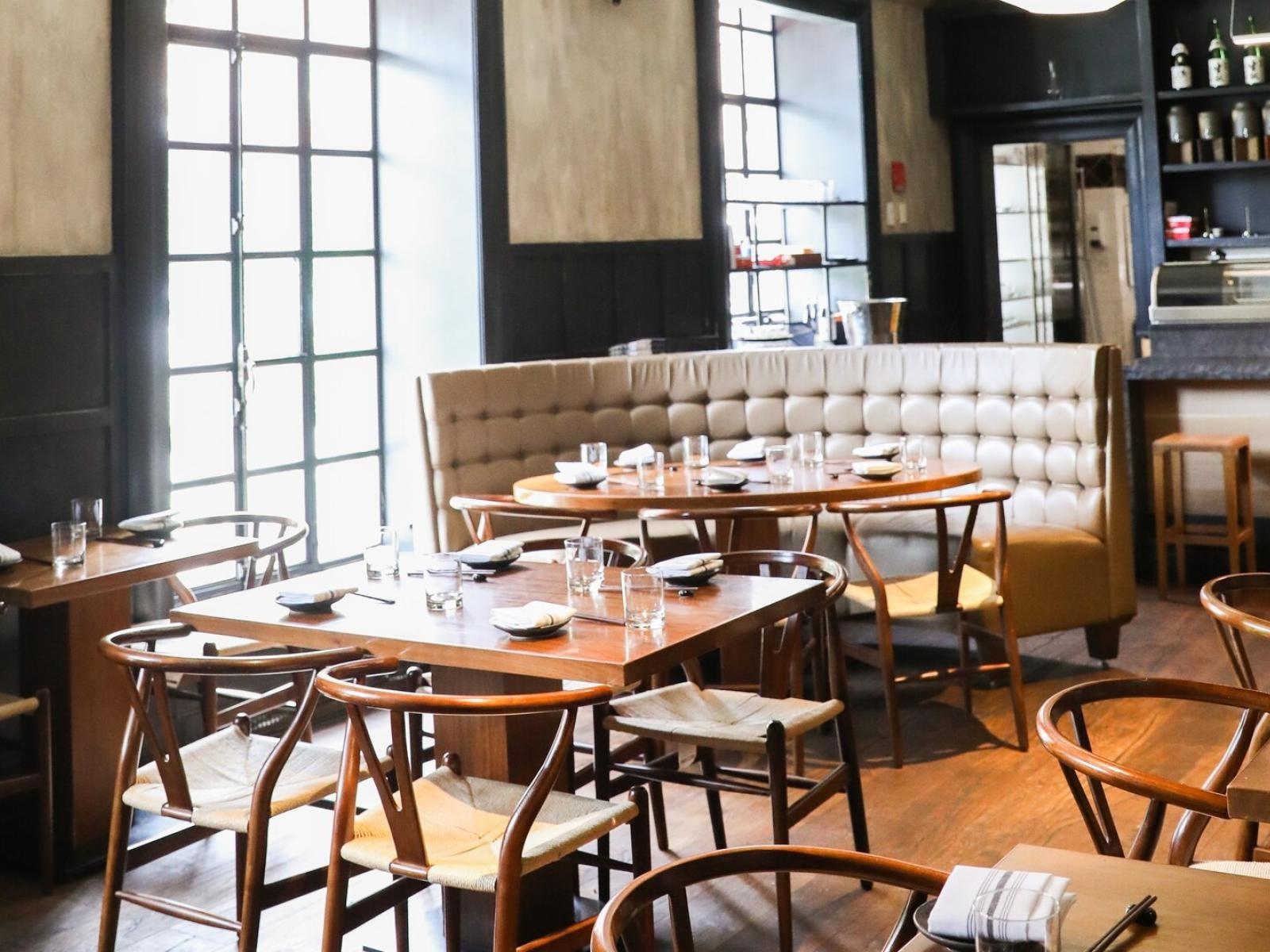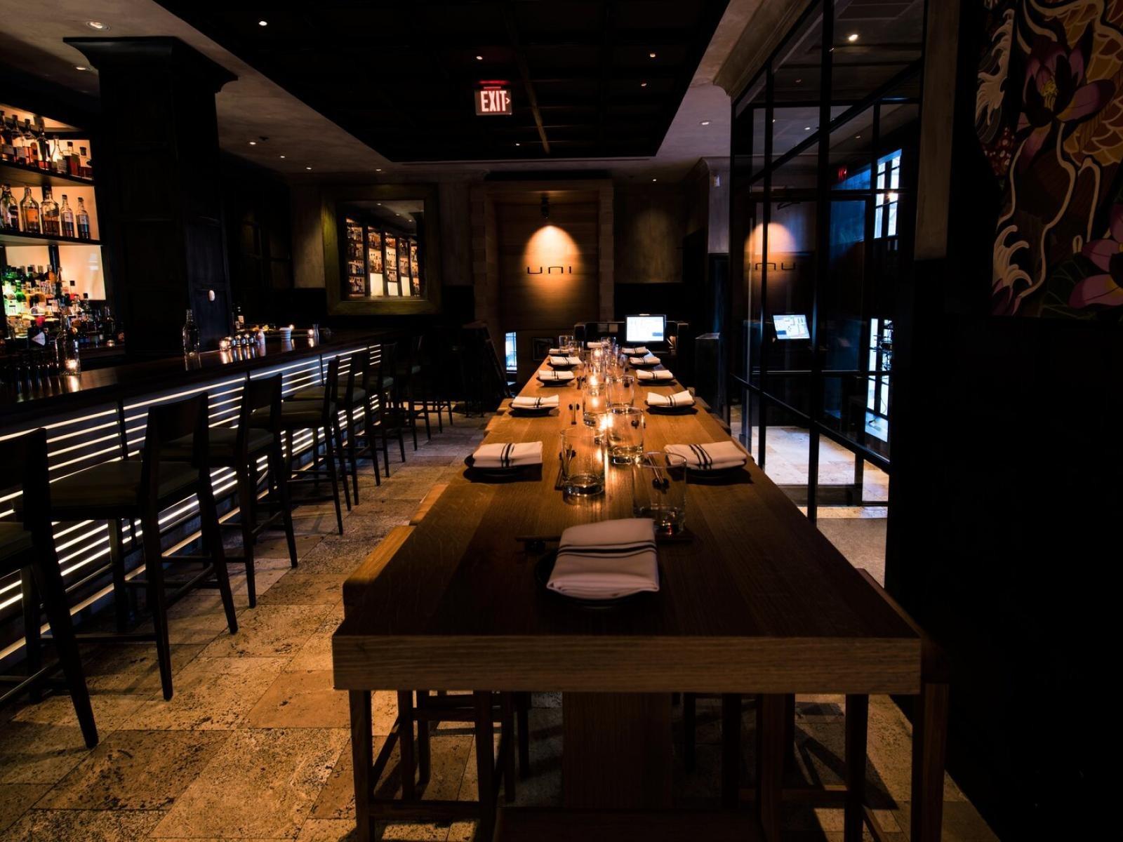 Experience an intimate and high-energy atmosphere at the handcrafted Communal Table. This striking centerpiece sits adjacent to the sleek, illuminated bar, offering guests a front-row seat to the vibrant pulse of the restaurant. With its warm wood tones and modern, dark-paneled accents, this space is ideal for lively rehearsal dinners or spirited wedding after-parties where conversation and connection are the main course. The sophisticated lighting and contemporary art provide a moody, upscale backdrop for an unforgettable urban celebration.