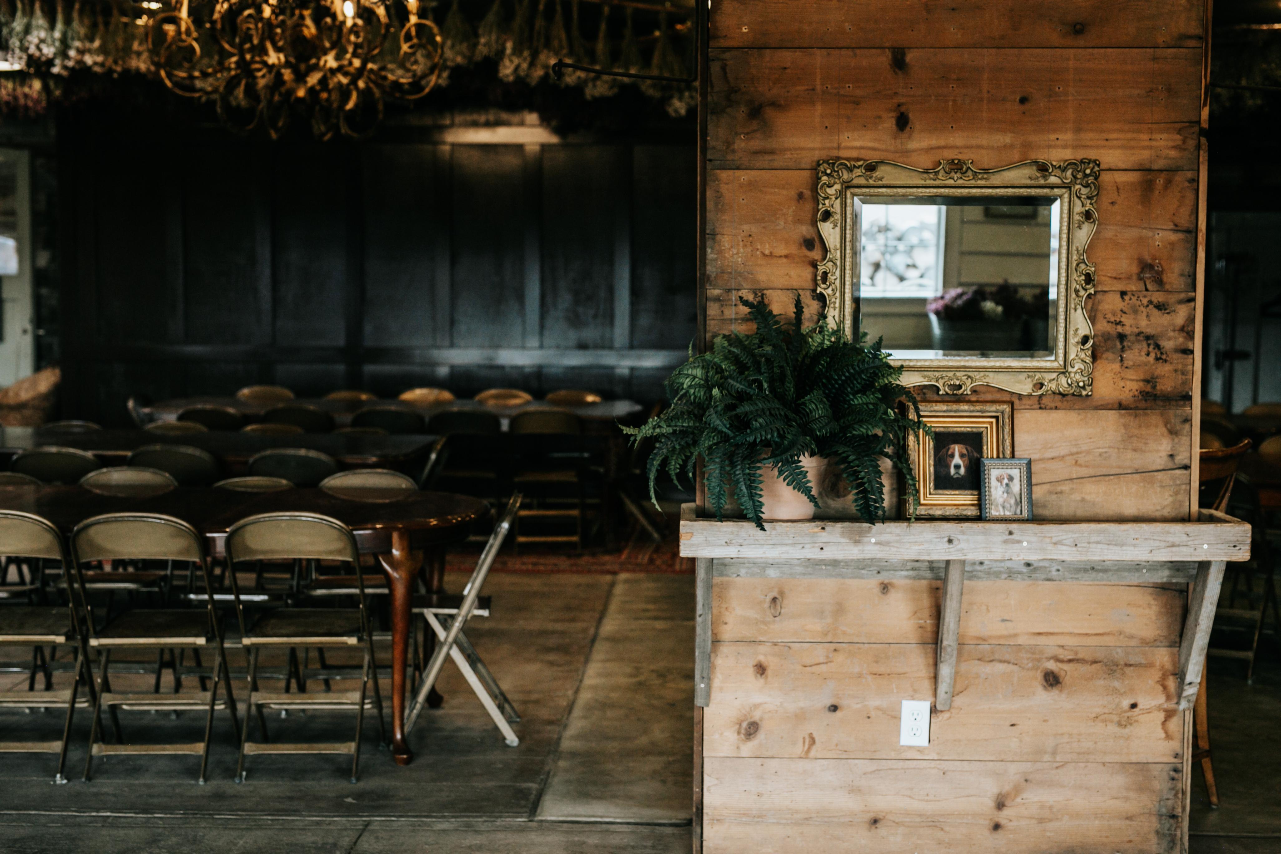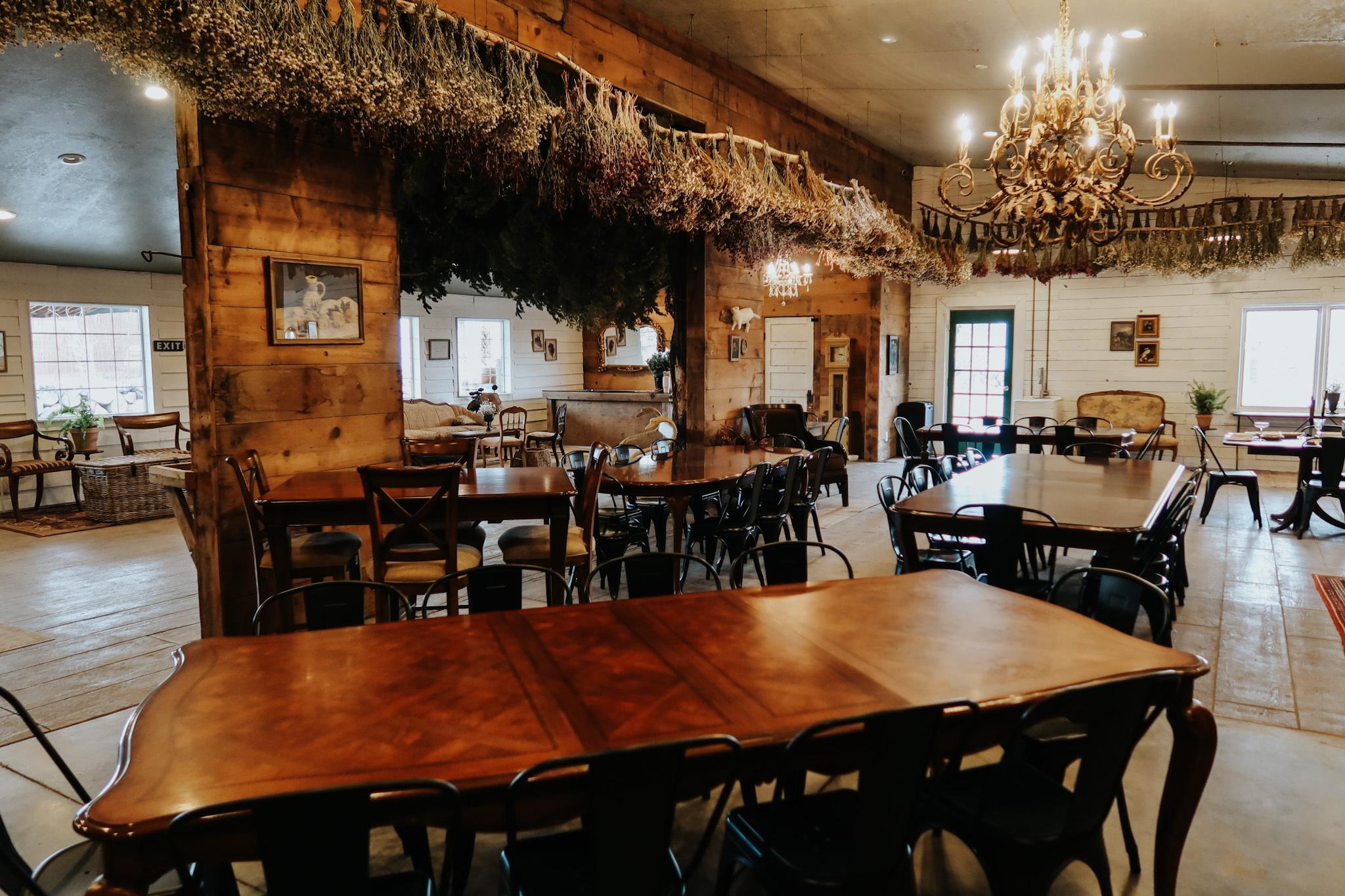 2,400 square feet of indoor and outdoor space. Grand chandeliers and warm ambient lighting. Rafters adorned with dried florals and The Kinlands signature seasonal tree. 20 antique tables and chairs for seated dining up to 100 guests. Layered lounging areas with vintage sofas. Dance floor area. Outdoor gardens with bistro-lit tables and a side patio. Climate-controlled comfort of heating and AC. On-site restrooms and dressing room. On-site guest parking and wheelchair access.