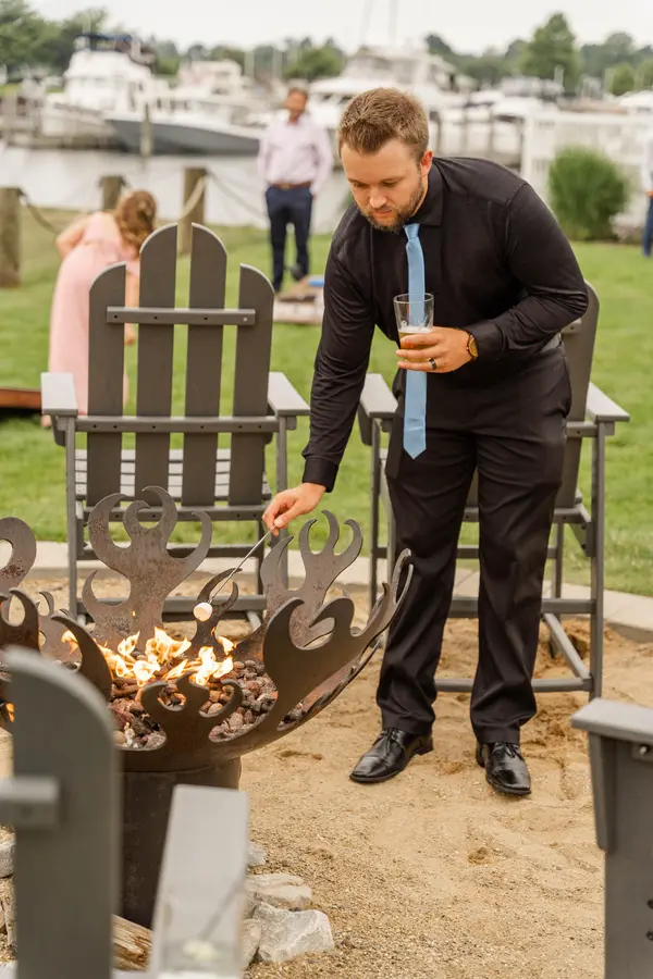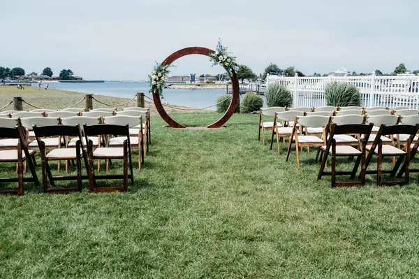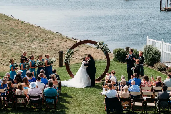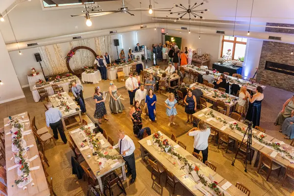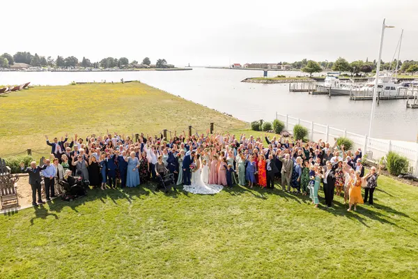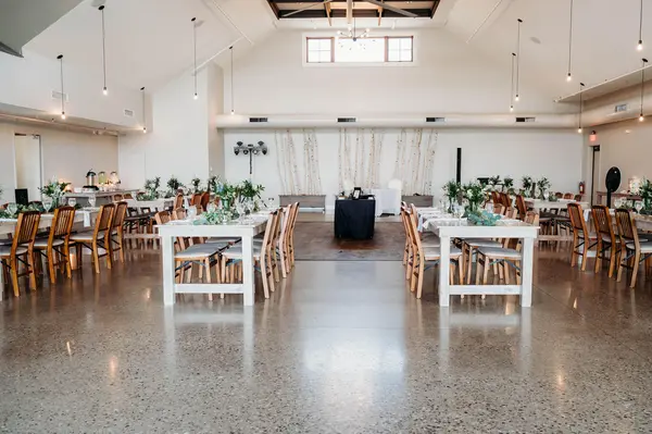 This waterfront property offers multiple gathering areas across a spacious 5,600-square-foot setting. The outdoor ceremony site overlooks Pere Marquette Lake, with a lakeside patio for cocktail hour featuring marina and car ferry views. An indoor-outdoor bar connects to the main reception area, where high ceilings, large windows, and an open layout create a bright, flexible space for dining, dancing, and celebrating.
