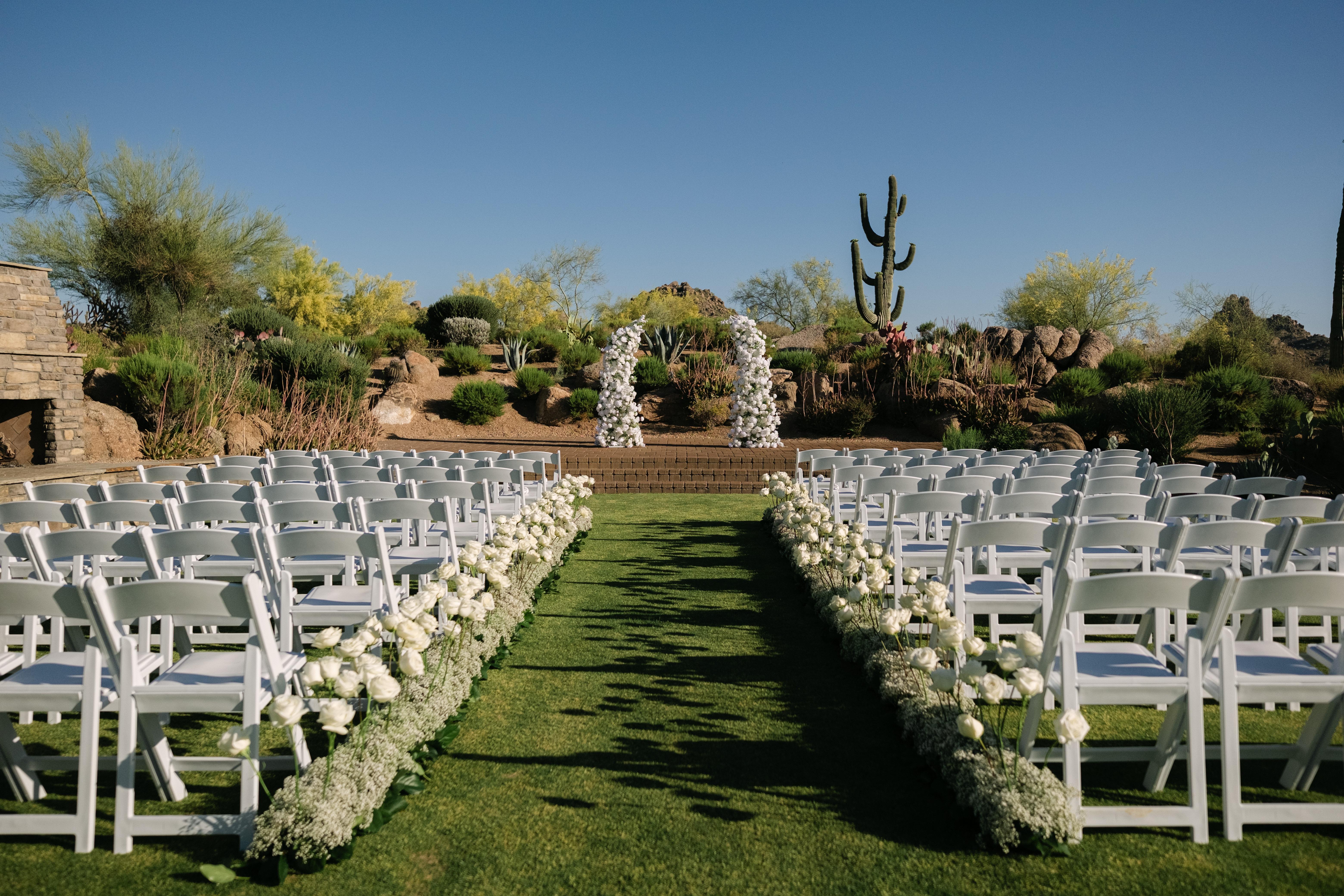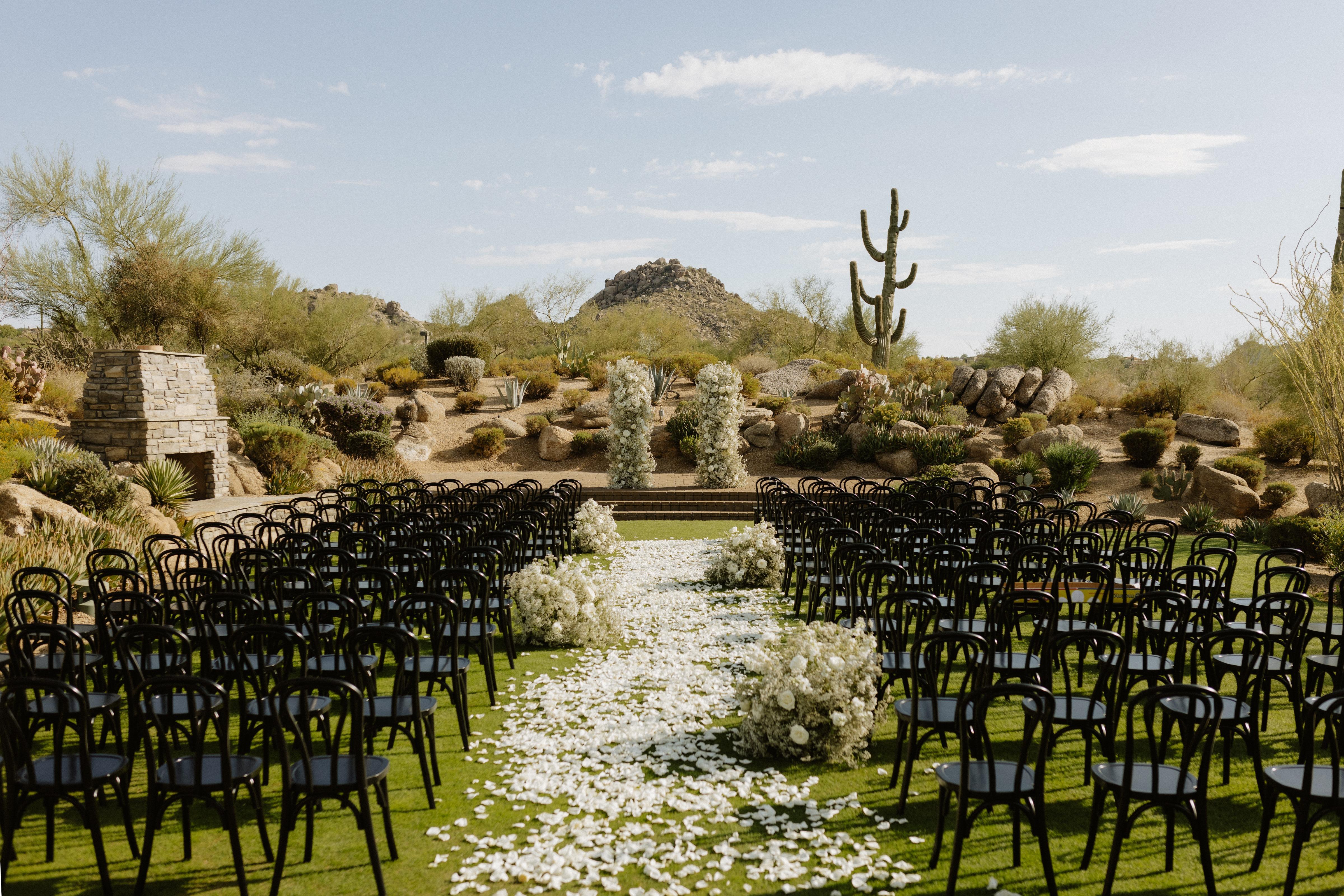 Luxury desert vows beneath majestic Pinnacle Peak.