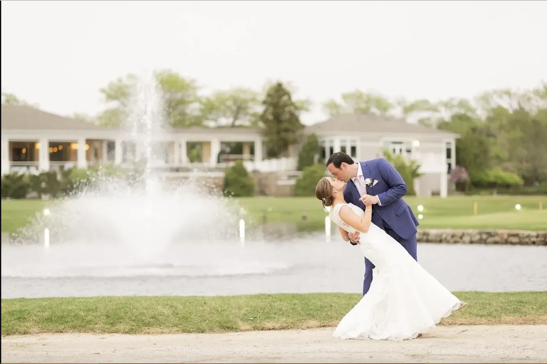 The Grand Ballroom blends coastal elegance with panoramic golf course views. Floor-to-ceiling windows overlook manicured fairways, water features, and classic New England architecture. The neutral design complements any wedding style, with a spacious layout, central dance floor, and covered veranda. A beautiful setting for receptions that flow easily from dinner to dancing.