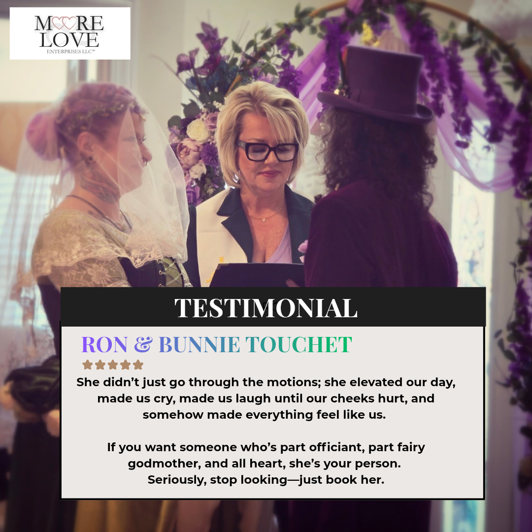 At Moore Love Enterprises, I create fully customized, heartfelt, and inclusive wedding ceremonies that celebrate love in every form. Whether you’re planning an intimate elopement, a vow renewal, or a traditional wedding with a modern touch, your ceremony will feel personal, meaningful, and true to you. I bring a calm, guiding presence to every celebration and offer support beyond the ceremony, including rehearsal coordination, reception blessings, and private first-look blessings. Serving Pennsylvania, Ohio, and West Virginia.. I celebrate love in EVERY form.