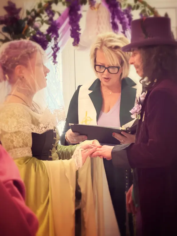 We found her on The Knot, and honestly, it felt like hitting the jackpot. We’d been dreaming of this handfasting for over 30 years, and from the very first conversation, she made it clear she wasn’t just showing up—she was living it with us. She checked in, laughed with us through our last-minute freakouts, and somehow kept her cool while we spiraled over the tiniest details. She instantly got our vibe—bold colors, wildflowers, handfasting cords, quirks, chaos, all of it—and even brought in a Star Trek reading that made our hearts soar (yes, she’s that awesome). She didn’t just go through the motions; she elevated our day, made us cry, made us laugh until our cheeks hurt, and somehow made everything feel like us. If you want someone who’s part officiant, part fairy godmother, and all heart, she’s your person. Seriously, stop looking—just book her.