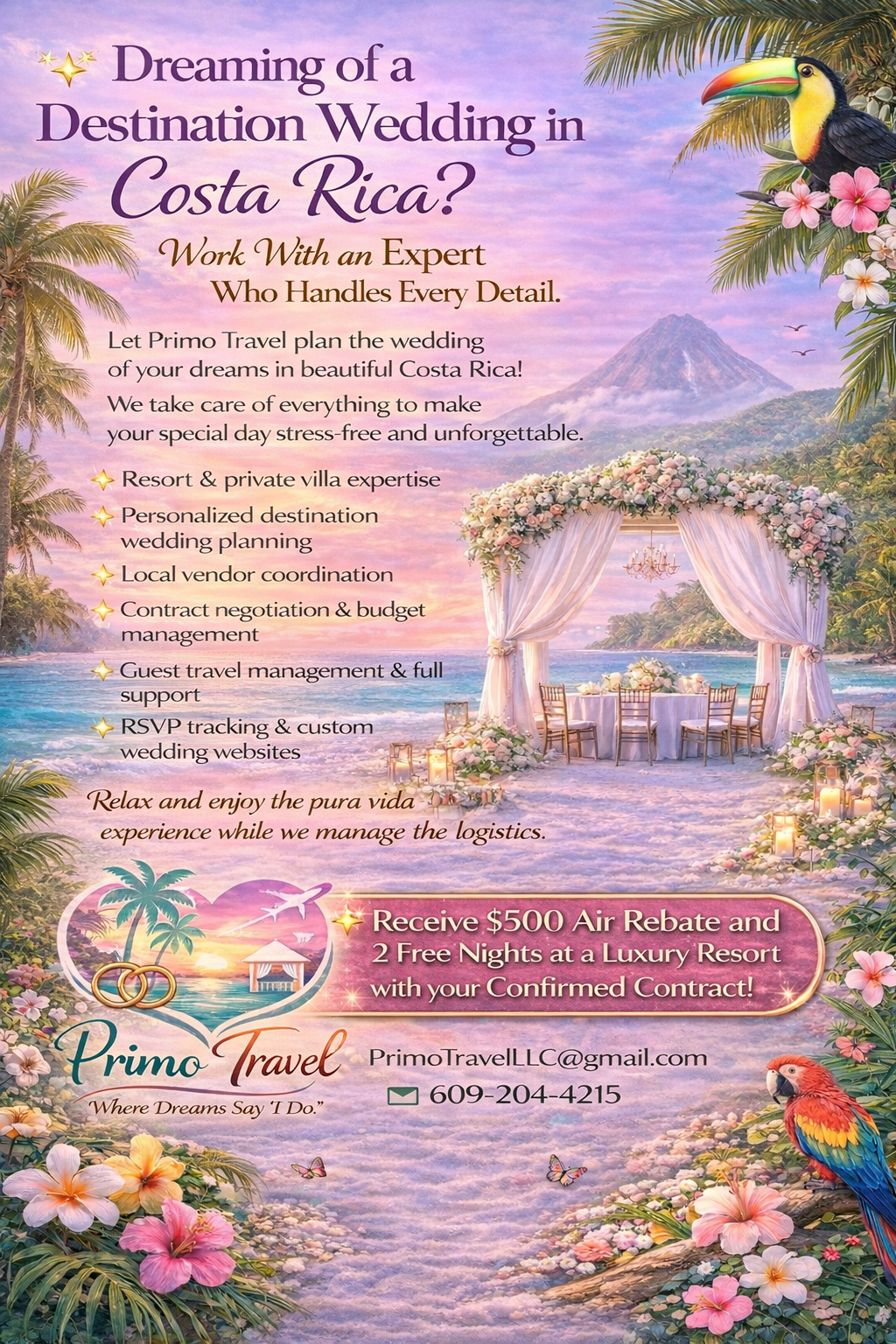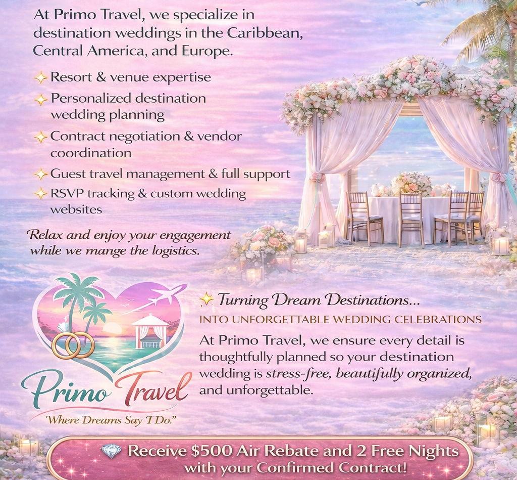 Primo Travel, LLC, helps bring destinations to life for couples in New Jersey, and beyond. Both destination weddings and honeymoons are an unforgettable experience for couples, and the Primo Travel team ensures every moment is seamless, easy, and fun. Why Use a Travel Advisor for Your Destination Wedding? A couple gets engaged and becomes really excited about a destination wedding, until they start thinking about questions. Questions about location, flights, rooms, transfers. This premier travel agency and destination wedding planner ensures every detail is handled, including venue selection, room block, and much more.