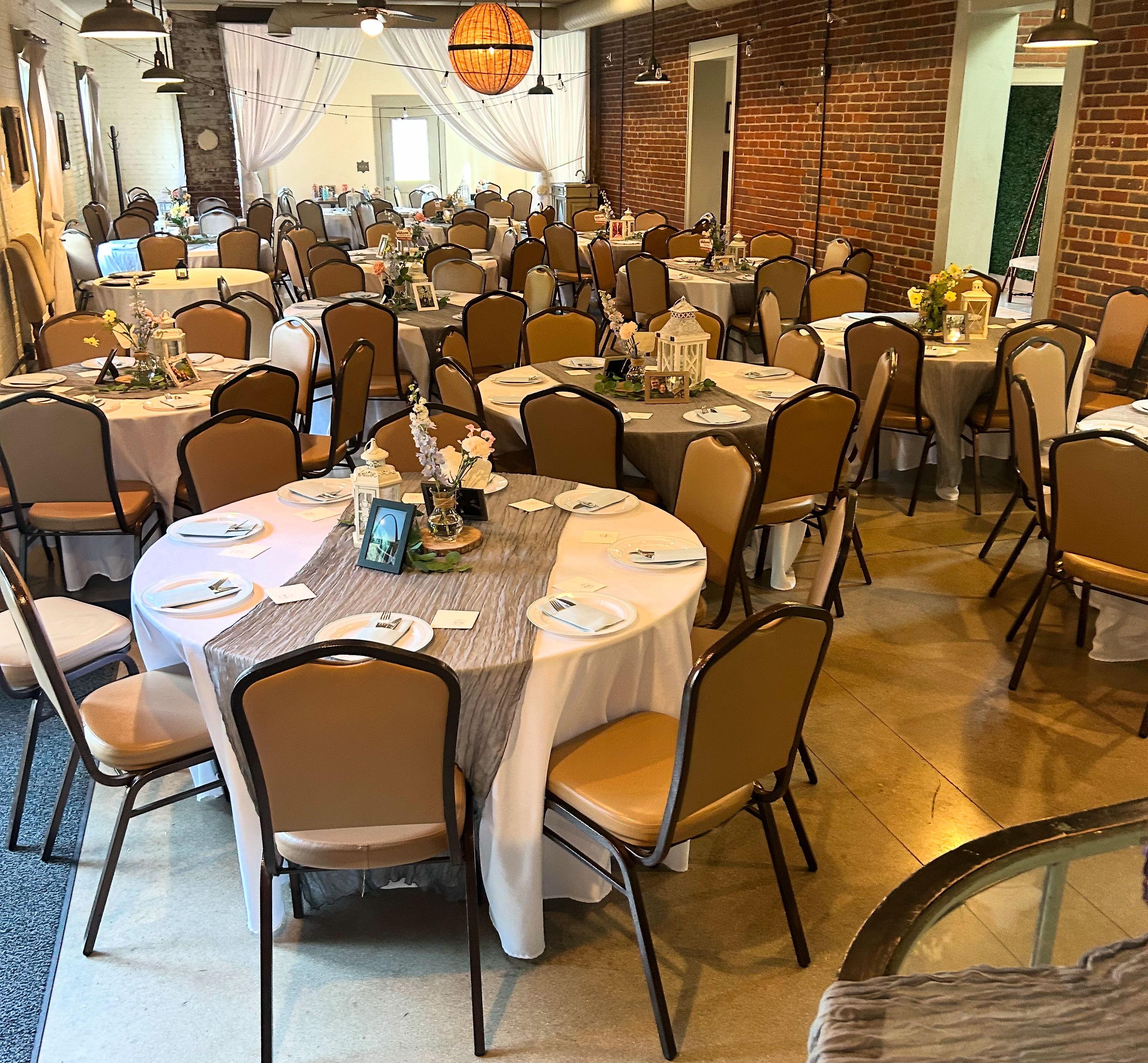 15 60” round tables 2 8’ rectangular tables 2 6’ rectangular tables Movable furniture pieces (antique bakery case, antique tables)