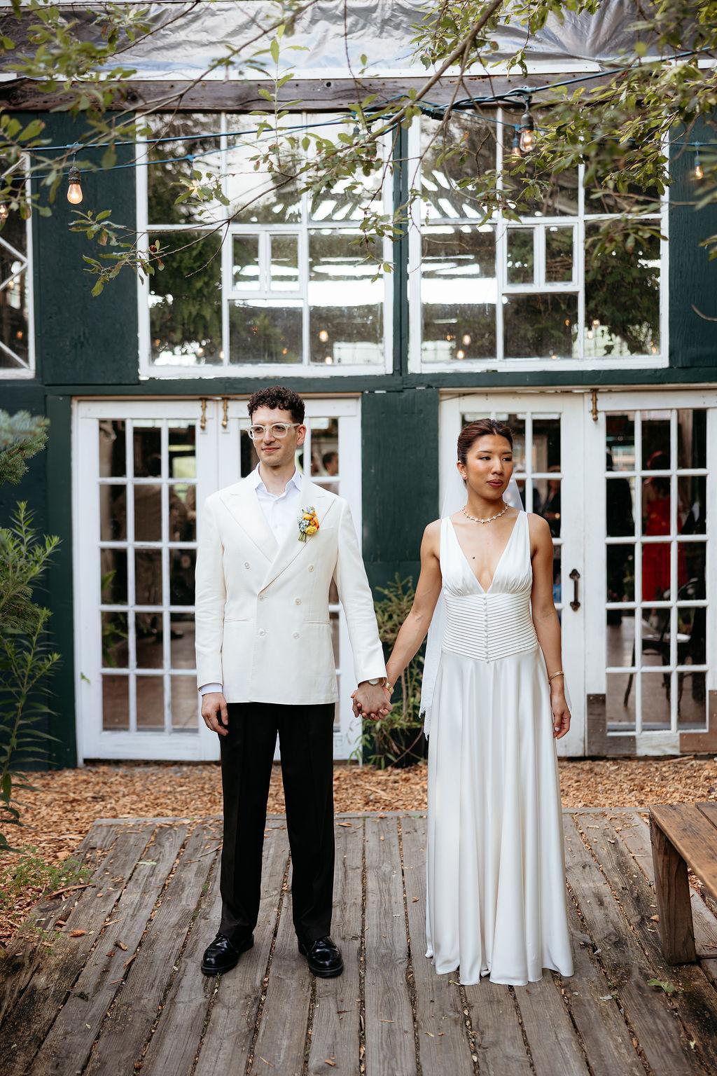 Filled weekly with hyper-seasonal florals and plants from the farm, the barn is a vibrant, walk-in ready space perfect for cocktail hours or intimate receptions. Guests can grab a drink at the beautiful wooden bar or mingle near the long harvest table laden with cheese, charcuterie, crudité, farm pickles, and house-made dips. The bright, airy main room flows seamlessly into the secluded backyard, providing a storybook hidden escape for you and your guests.