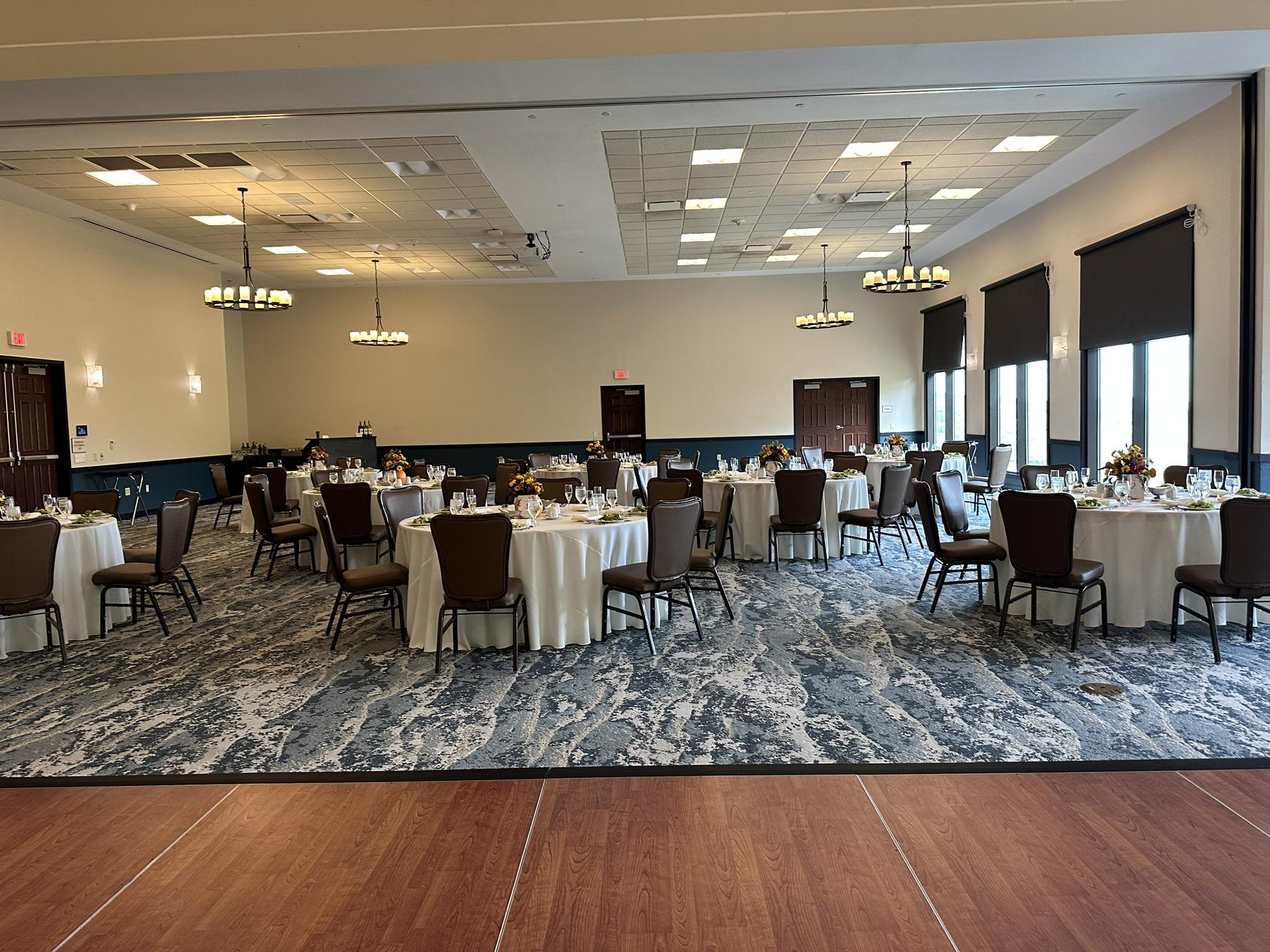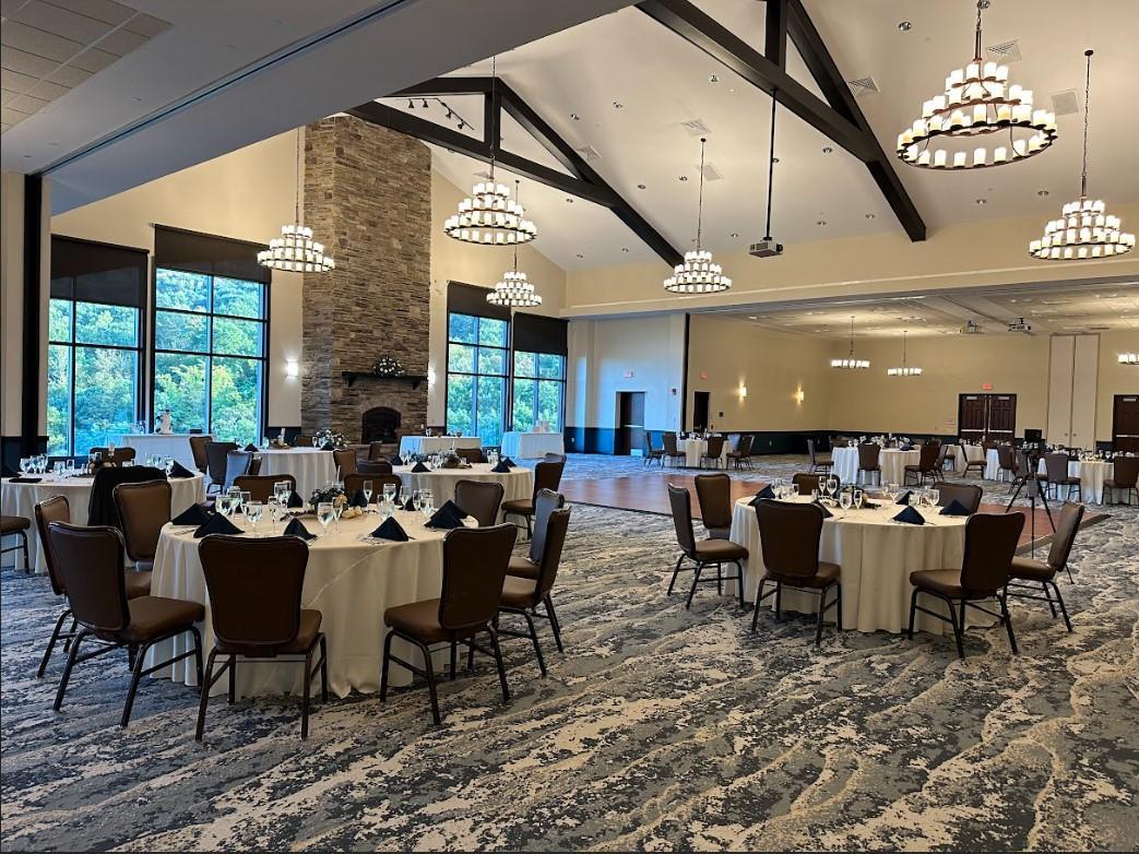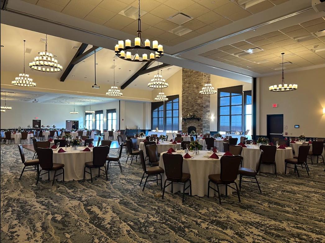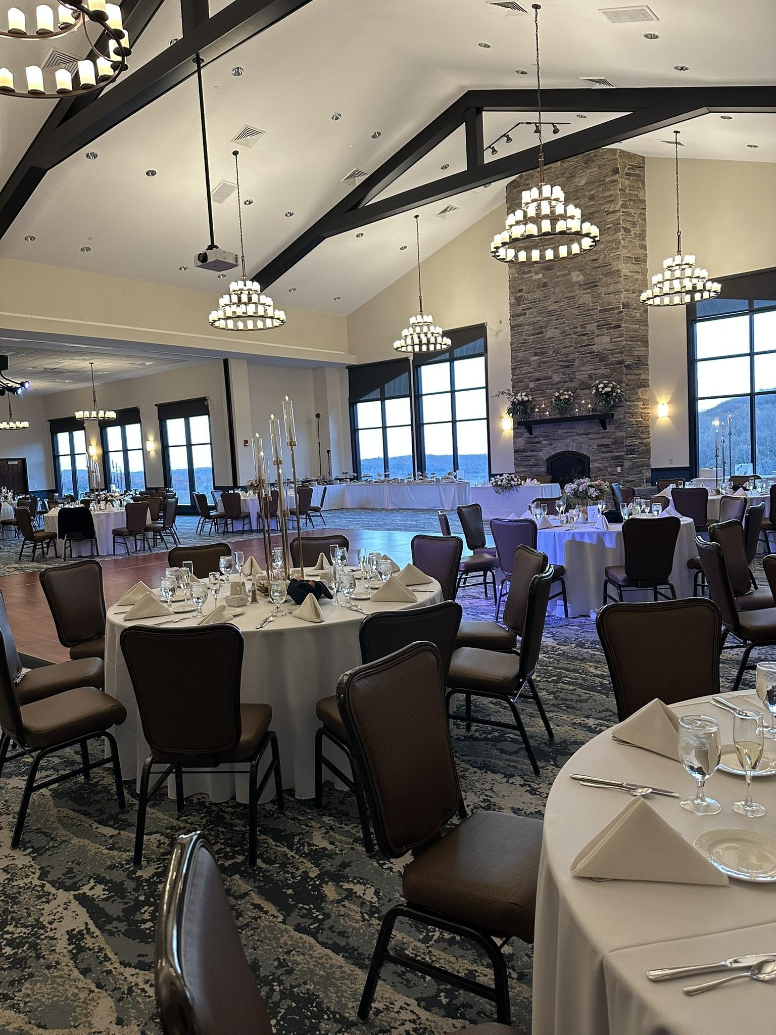 All tables (6' Round), standard banquet chairs, place settings, glassware, linen (white or ivory) and your choice of napkin color from a selection. -Working Fireplace -Chandeliers -Limited Customizable Overhead Lighting