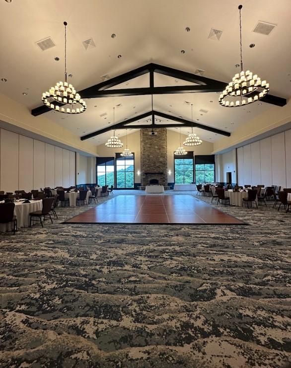 This space features 7500 square feet of space adorned with a working fireplace, chandeliers and exposed wooden beams that can be sectioned off for smaller events.