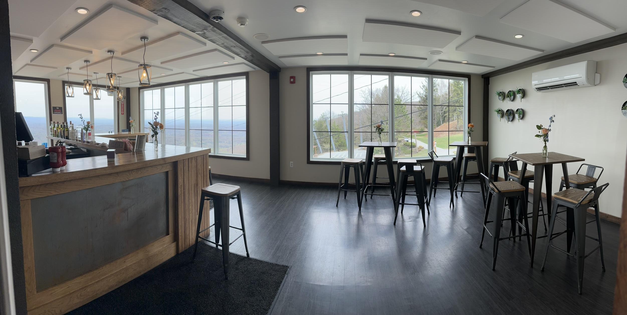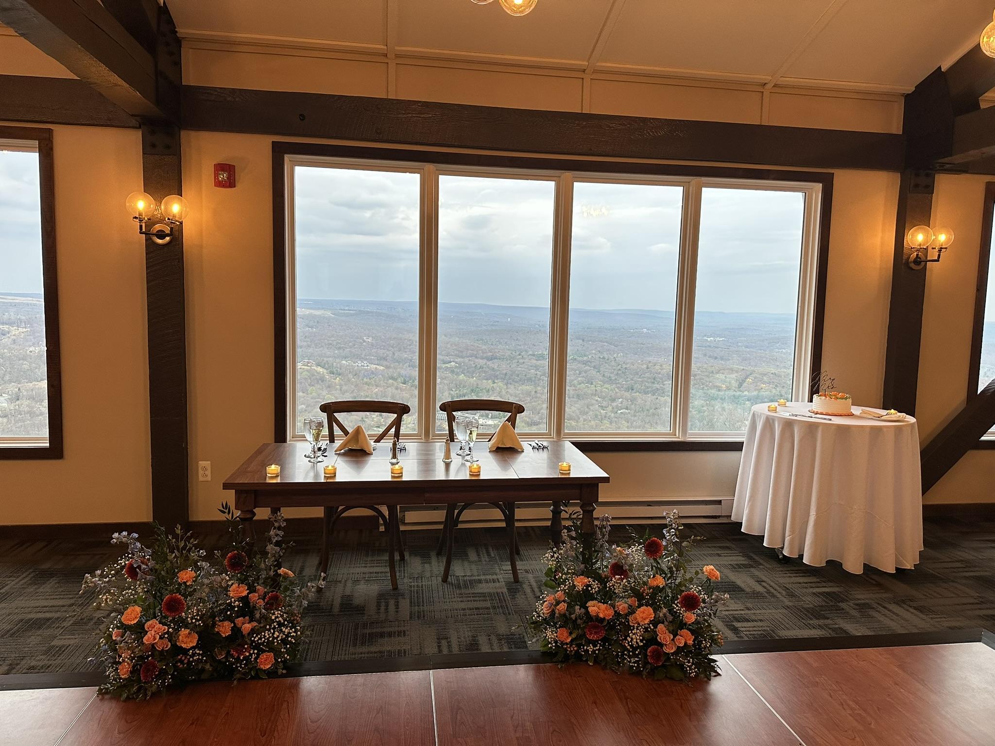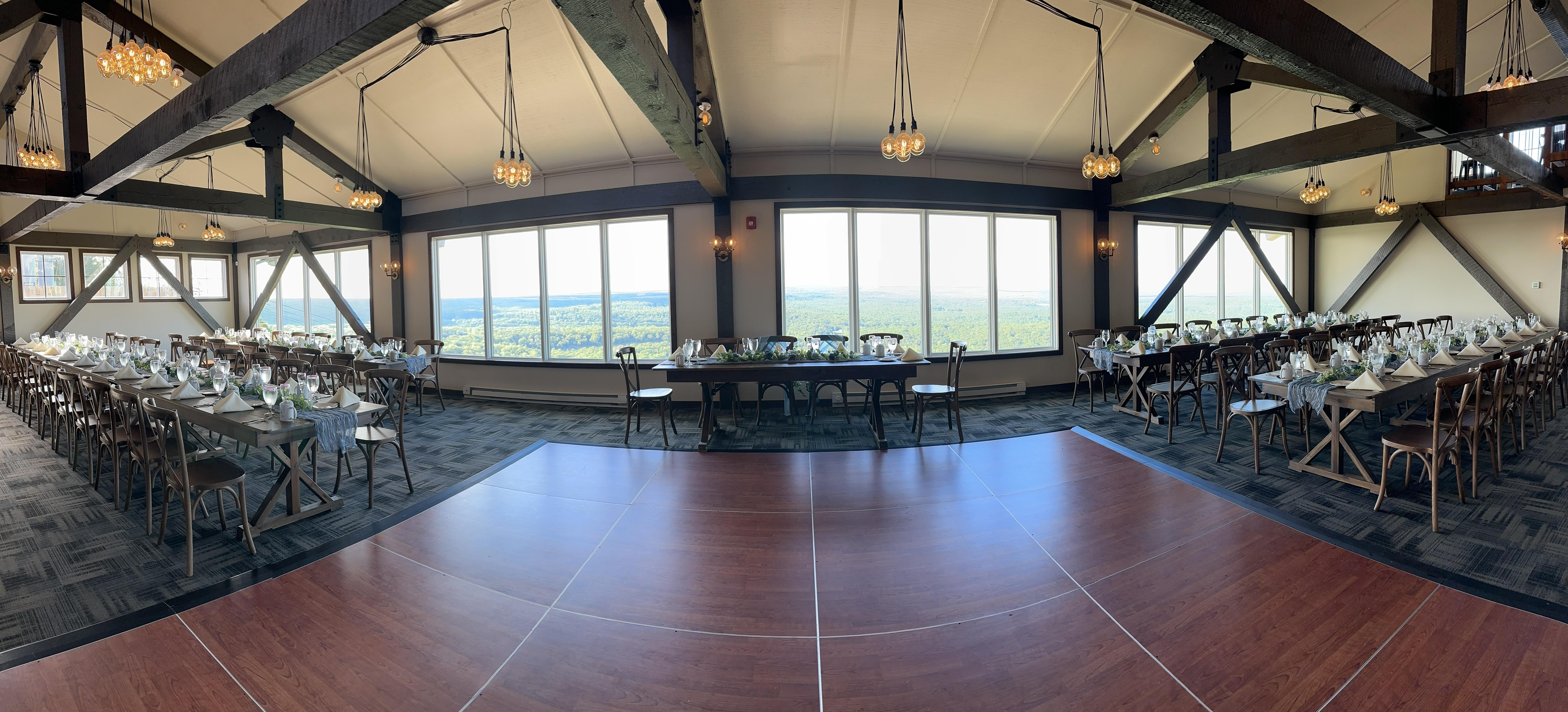 This multi-level event venue including your lower level and deck for cocktail party and upper level lined with windows for your reception will be sure to wow your guests with views of the mountains.