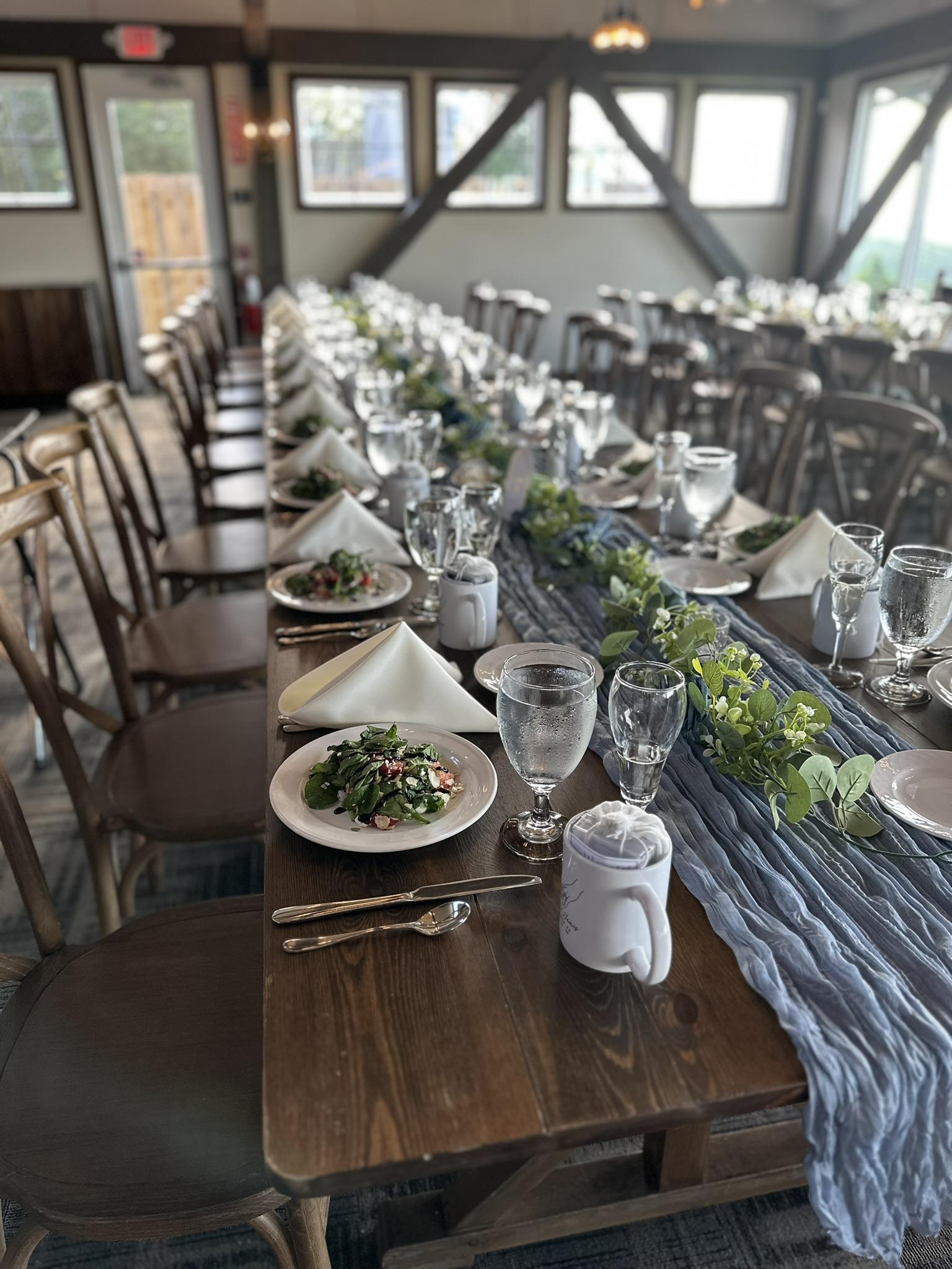 -8' Rectangle Wood Farm Tables -Ivory Napkins -Rustic Chairs -All Place Settings and Glassware -Dance Floor