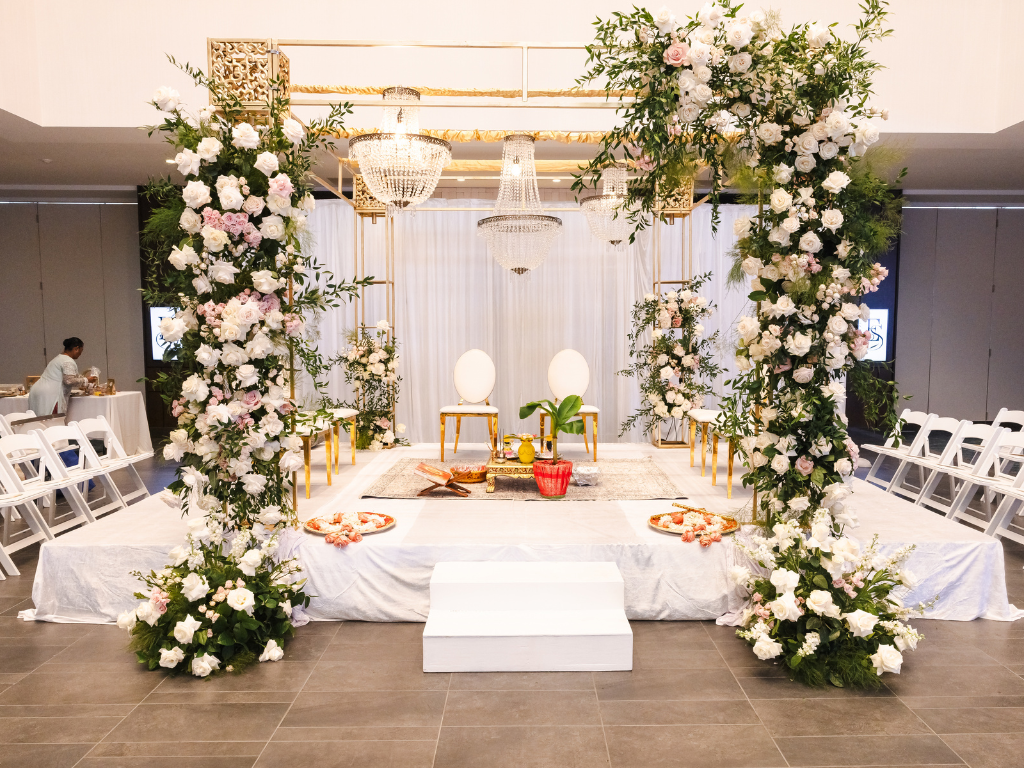 Floor-to-ceiling glass walls fill the indoor rooms with natural light for a sunlit celebration.