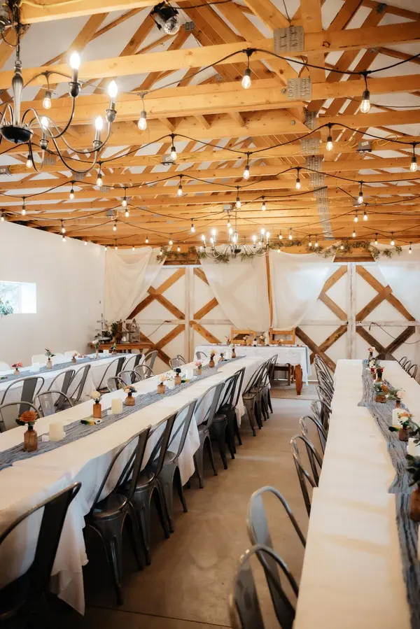 The Barn for reception includes: • 12+ dining tables + side tables for food and cake, wedding party tables • wooden head table • 2 options for table cloths • 125 chairs available • room for dancing/DJ • 2 options for chandeliers • projector, projector screen, portable PA system w/ mic • covered patio with 6 cocktail tables • keg tub dolly • portable bar • sound system with indoor and outdoor speakers, wifi • radiant heat if needed in cooler months • restroom with 2 stalls