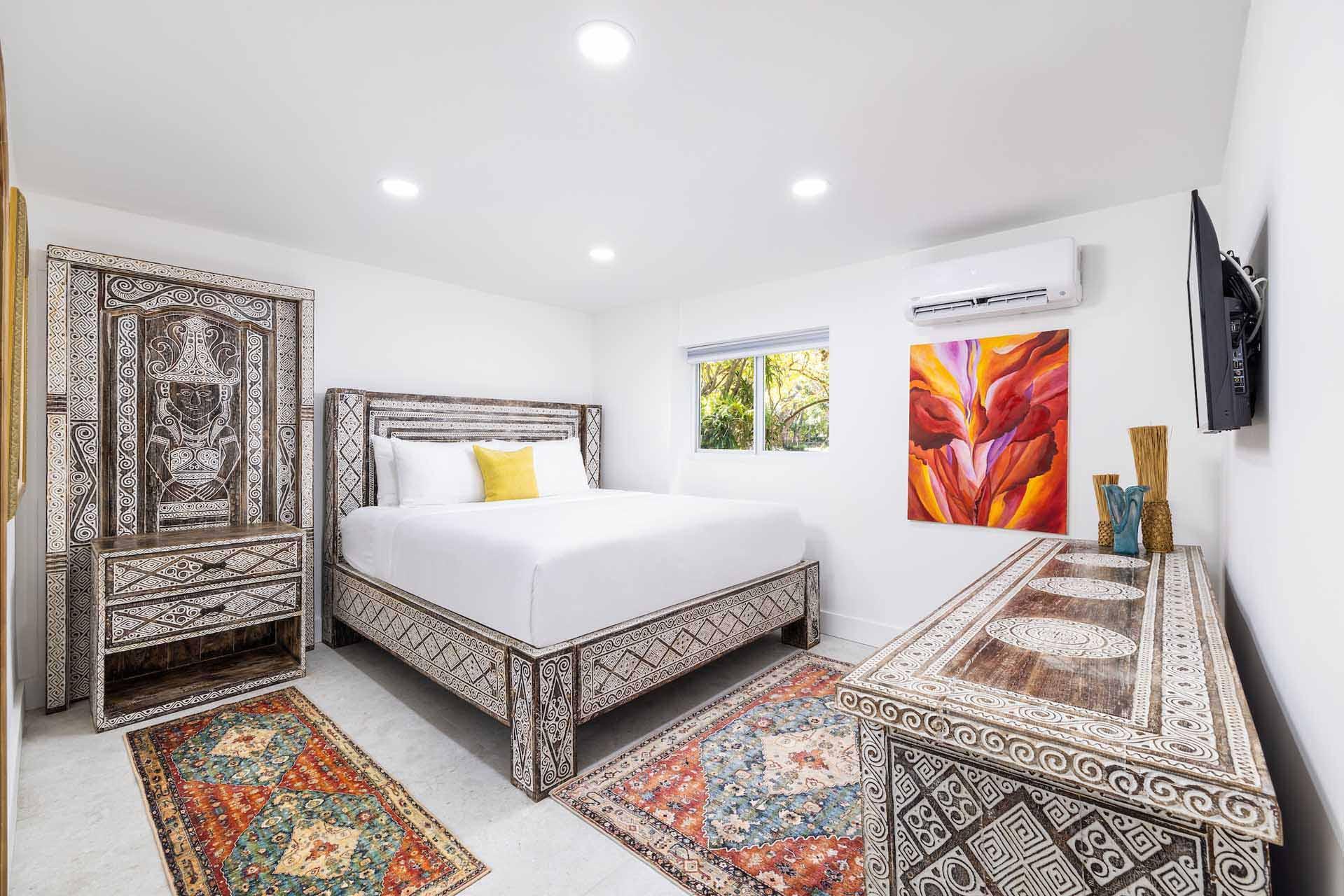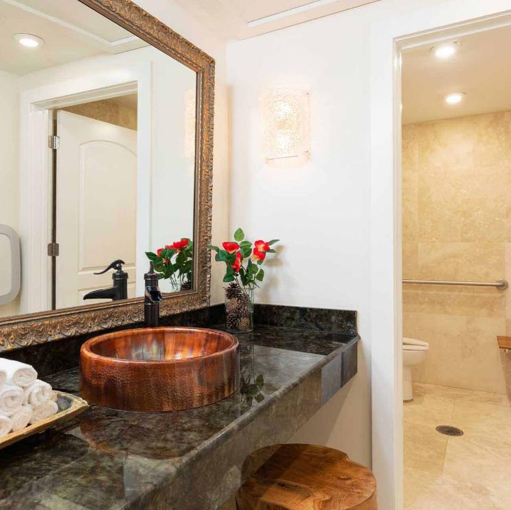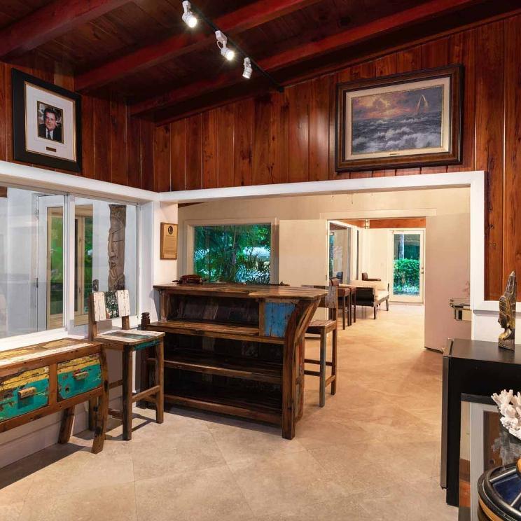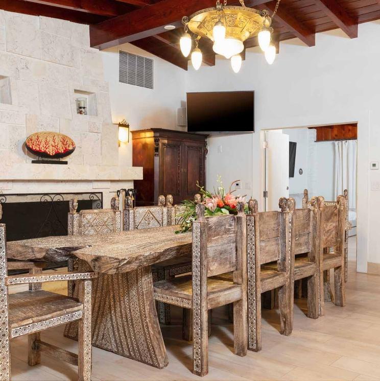 The Grand Lodge is a 5,000 sq. ft. private residence designed for comfort and elegance. Featuring three bedrooms and five baths, the space includes a dramatic coral stone fireplace, handcrafted Balinese furnishings, and a striking living tree rising through the roof. A chef’s kitchen with Wolf appliances and a dedicated culinary space make it ideal for intimate dinners, celebrations, and pre-wedding gatherings just steps from the water.