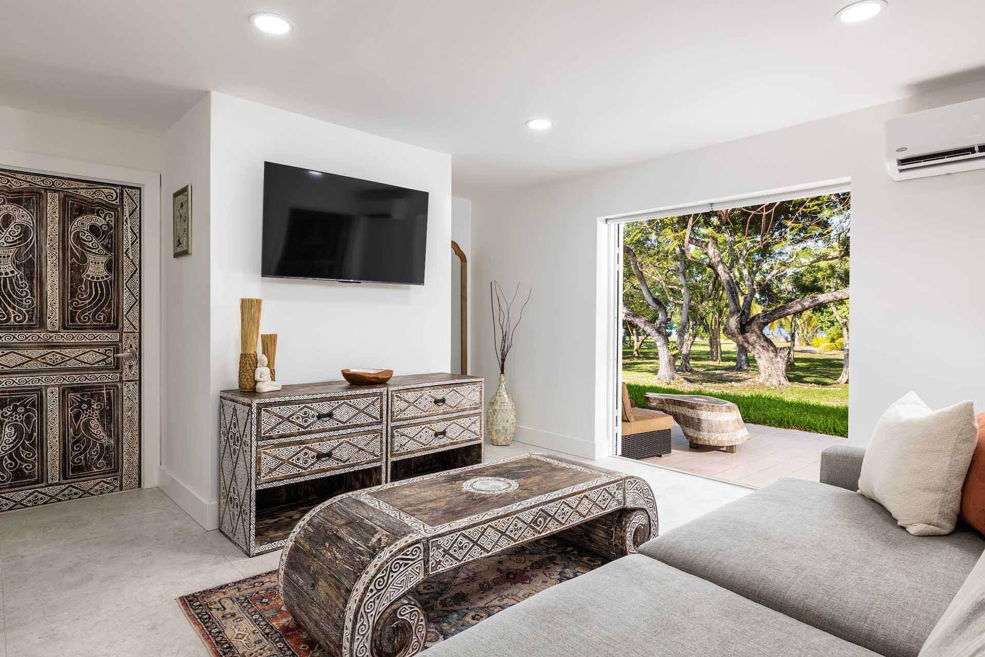 The Shore House is a 2,500 sq. ft. private retreat designed for comfort and connection. With three bedrooms, four bathrooms, and separate guest entrances, it offers the perfect blend of privacy and togetherness. Balinese wood accents and artisan furnishings create a warm, elegant atmosphere, while outdoor dining areas overlook lush greenery and the bay. A modern coastal kitchen and serene design make it ideal for relaxing, gathering, and enjoying the beauty of the Keys.