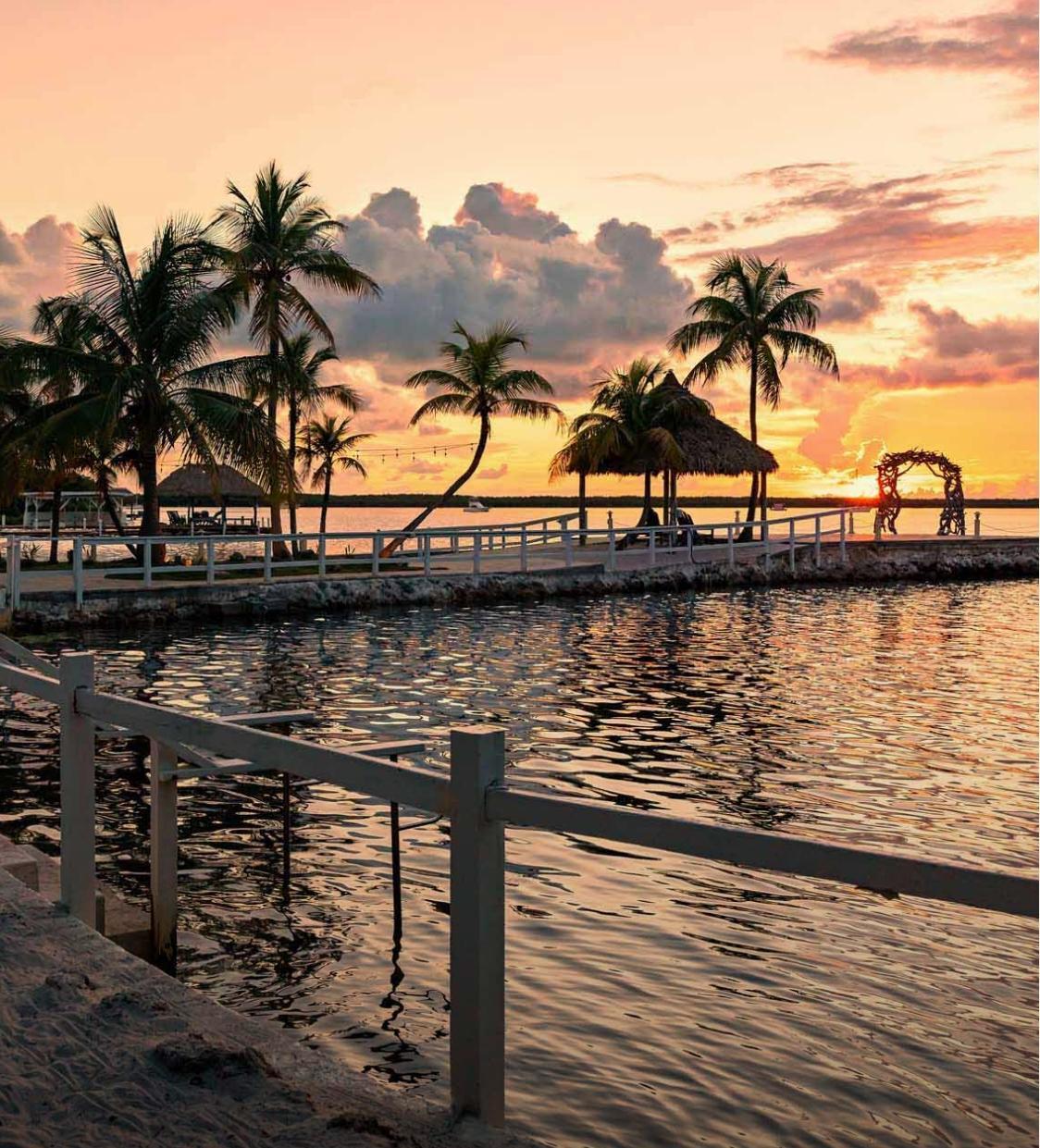 The Sunset Pier is one of Largo Resort’s most iconic waterfront features. This private concrete pier extends into the Gulf, offering sweeping views of the horizon and breathtaking Keys sunsets. Shaded seating beneath a palm-thatched tiki hut creates the perfect place to relax, take photos, or enjoy a quiet moment by the water. Whether for golden-hour cocktails or simply soaking in the view, it’s a romantic setting couples and guests won’t forget.