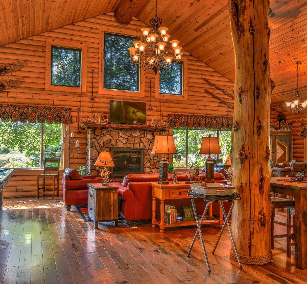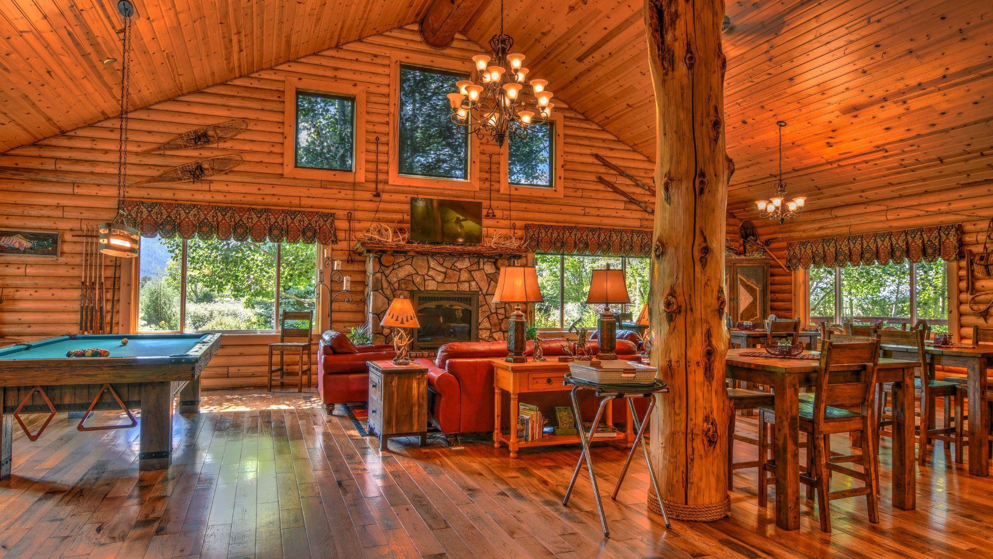 A cozy western log lodge with a grand stone fireplace and an intimate space for your wedding celebrations.