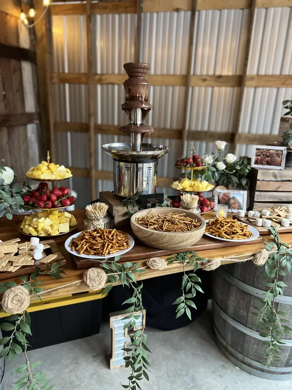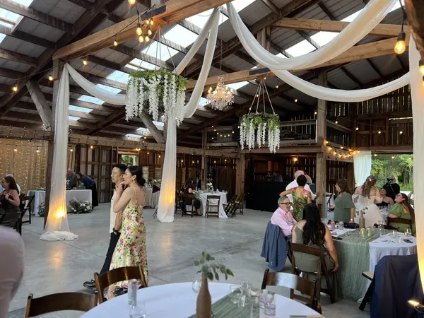 - Cafe lights re-strung throughout the barn for every event - Antique crystal chandelier - 13 sliding barn doors that can be opened and/or closed based on a bride's preference - Optional chiffon drape around chandelier and framing our 14-foot front barn doors - Cozy nook with propane fireplace and surrounding benches - Hanging flower baskets