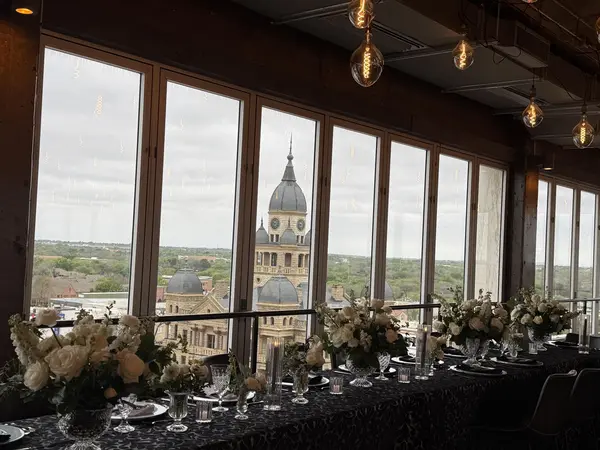 Sunago Bell is a romantic wedding and event venue located in Denton, Texas. This remarkable venue offers couples a versatile and fully customizable space to host the wedding of their dreams. Here, a modern loft aesthetic meets elegant decor to create a warm and welcoming atmosphere for couples to celebrate their day with loved ones. The dedicated team of event specialists at Sunago Bell is honored to welcome couples as they gather together with friends and family on their joyous day. With a delicate balance of industrial charm and modern decor in an urban setting, the venue offers a picturesque location for an unforgettable event. As you walk down the aisle, your ceremony will be warmly illuminated by 300 individually hand-blown glass bulbs hanging above. Surrounded by panoramic views of the city, guests are welcome to dine and dance the night away, their celebration set to a vibrant backdrop.