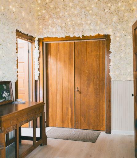 Guests are welcomed in the floral-lined entryway illuminated with microlights woven throughout, creating a warm, enchanting path into the celebration.