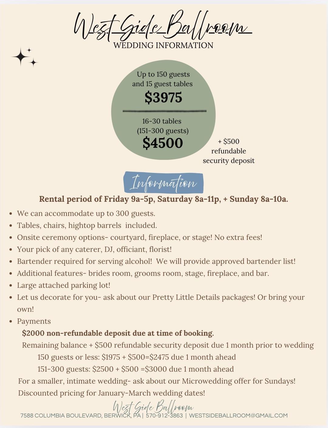 West Side Ballroom is a spacious wedding venue that can accommodate up to 300 guests. We include tables and chairs. We have a bar area, kitchen, stage, bride's room, and groom's room for you to use during your wedding! We offer 3-day rentals for weddings. Our venue holds a lot of history! It used to be a place for people to go line-dancing, was a bowling alley, and a flea market. We kept the bowling alley floors to bring some history and charm to the Ballroom! We renovated and updated other aspects to bring it back to life! We offer decoration packages- we fully set up and style whatever decorations are rented- or you are welcome to bring your own to set up. You can do whatever you can envision with the space. We do not require specific caterers- our only requirement is that you use one of our pre-approved bartenders. Recommendations can be given for vendors you may be looking! Check out our Facebook page for more info!!